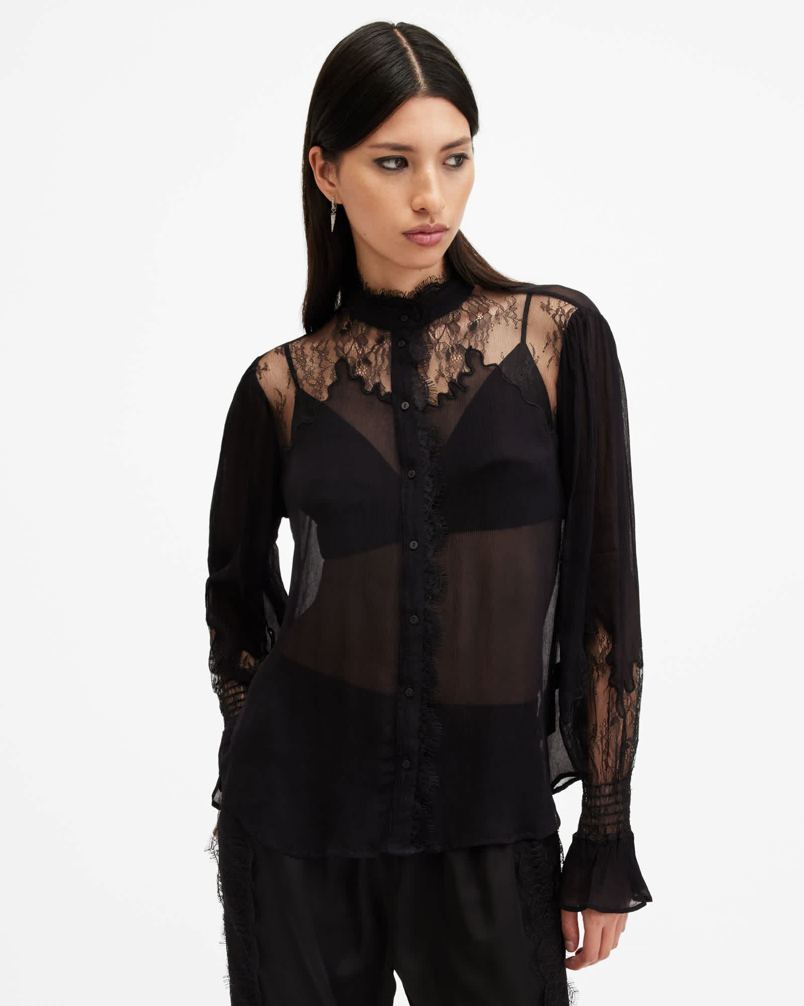 Crafted from a lightweight chiffon with gathered lace detailing around the statement collar and throughout the sleeves too.