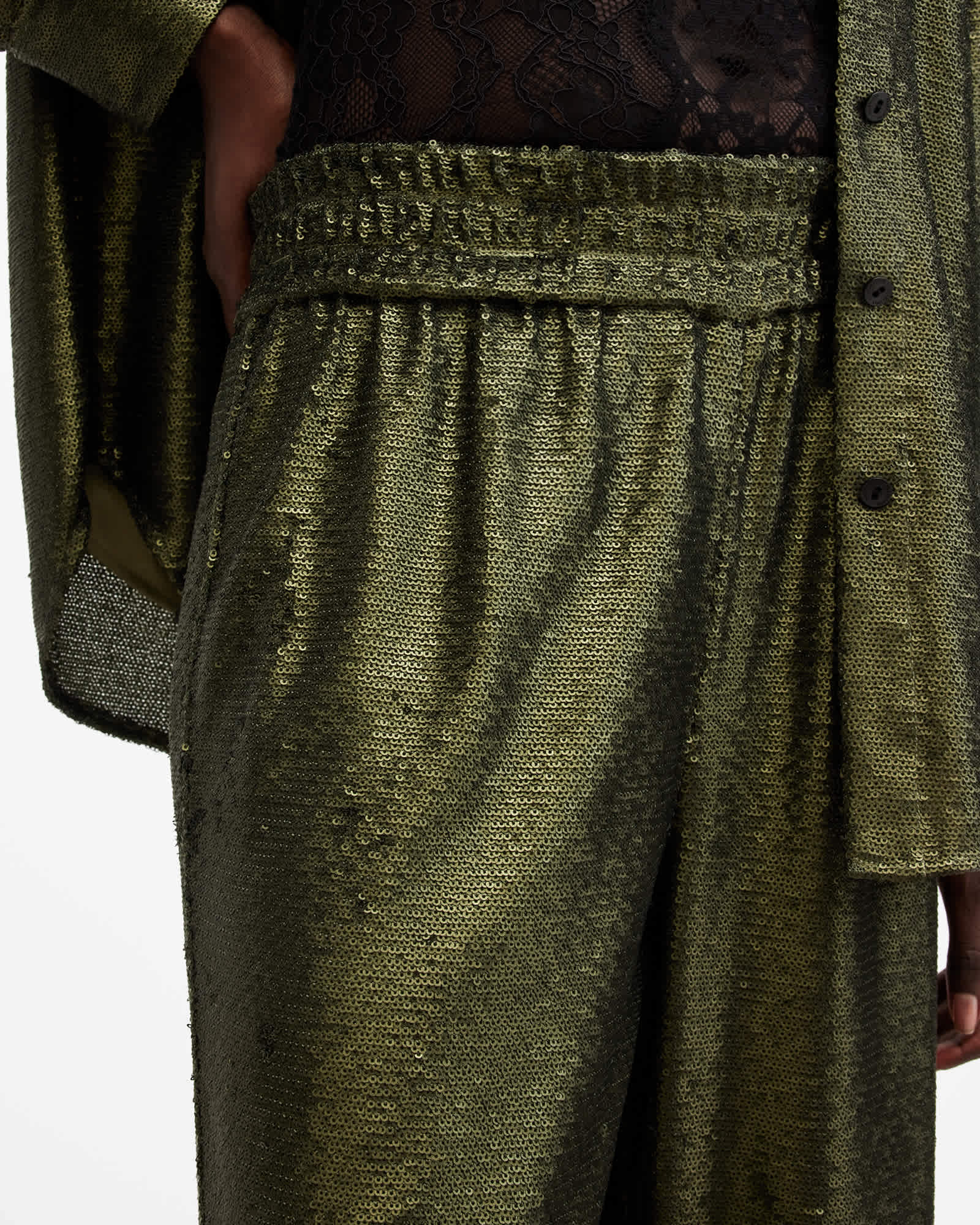 These trousers are designed to a regular fit Pullover High-rise fit Elasticated waistband Two front slant pockets Full length Wide leg AllSaints branded metal bar Sequins