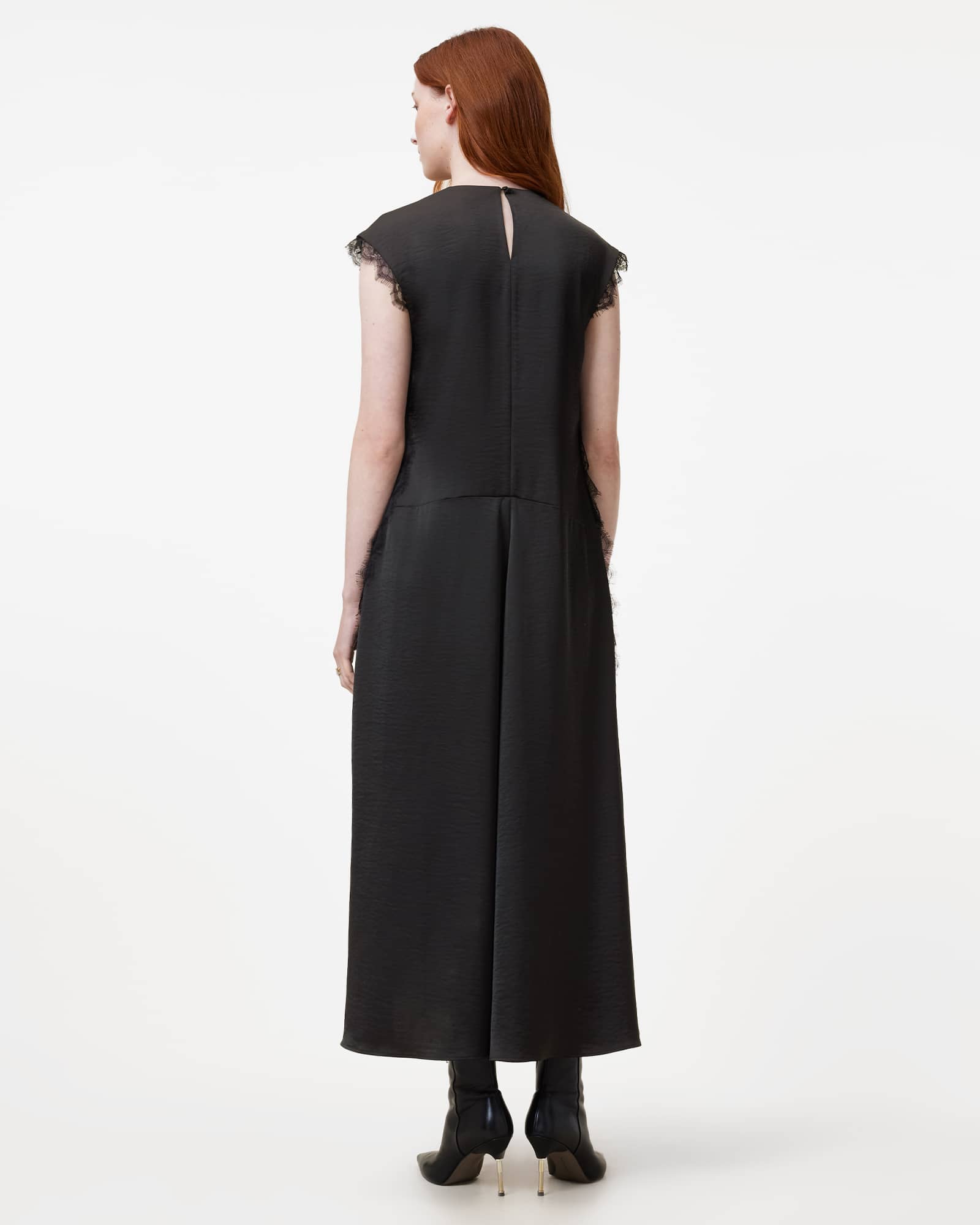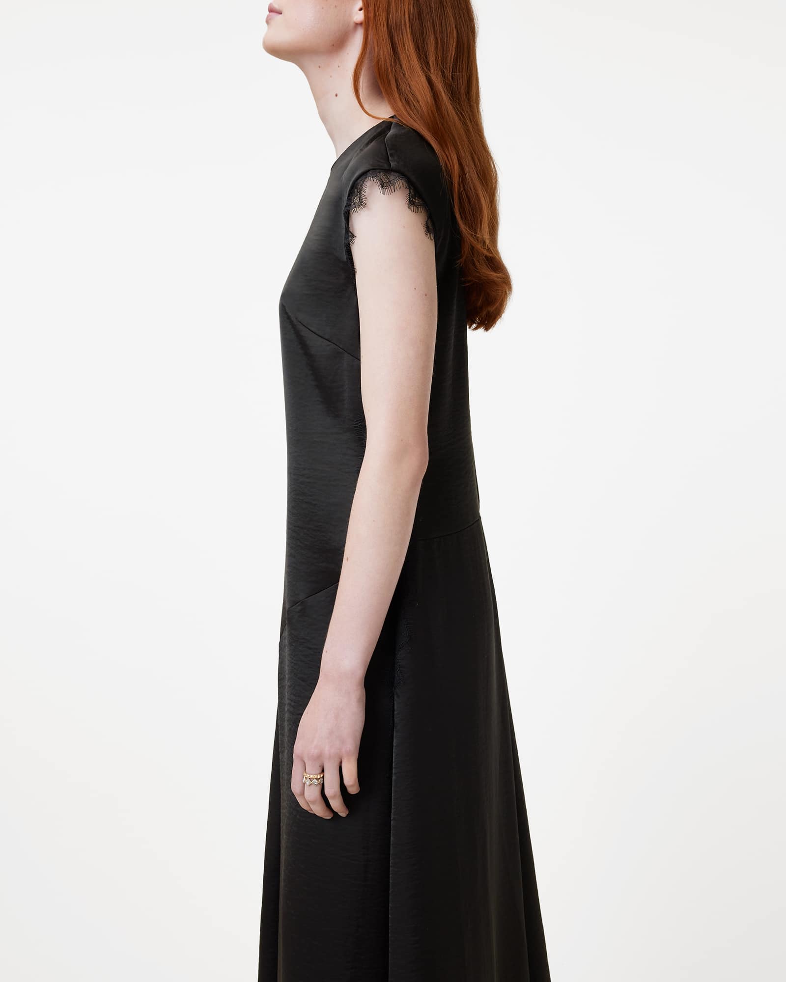 This dress is designed to a regular fit Button-fastening keyhole at back Crew neck Short sleeves Asymmetric hem Midi-length Lace trims Side splits Recycled fabrics