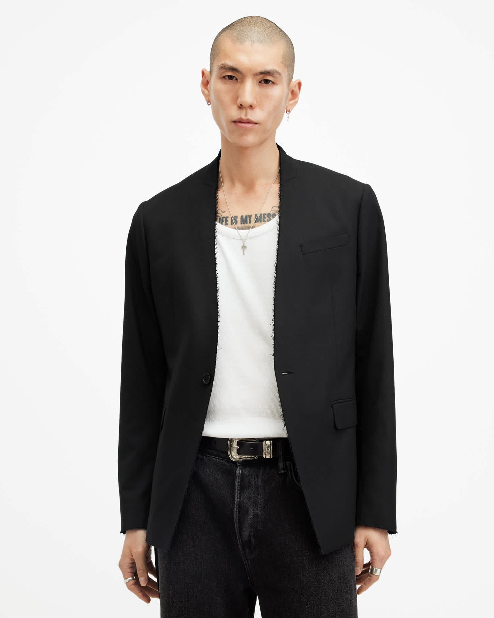 This blazer is designed to a slim fit Single button closure Long sleeves Collarless Three pockets Raw-edge finish The Archive Collection is a curated edit of limited-edition pieces that reincarnates iconic styles from the past 30 years of AllSaints.