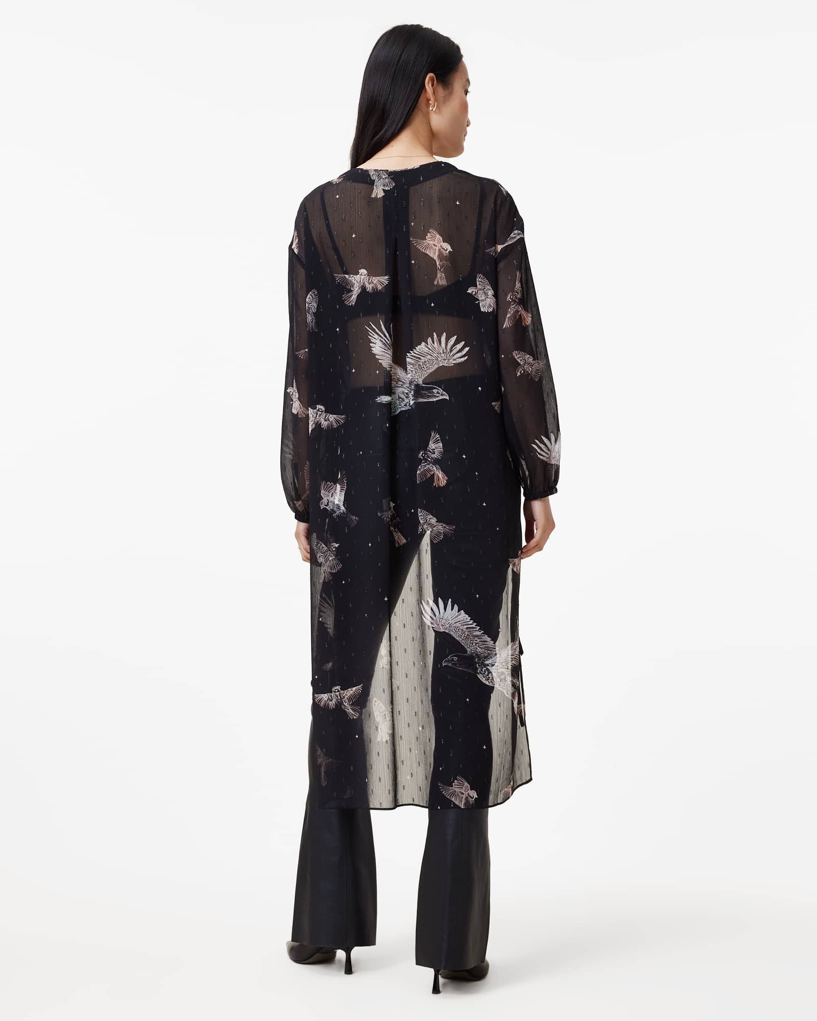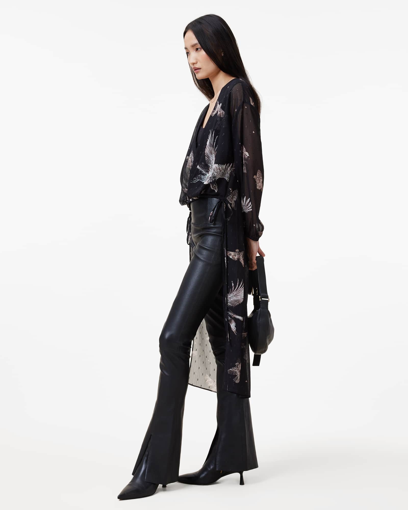 This top is designed to be worn oversized Pullover Round neck Long sleeves Sheer fabrication New-season print Crossover wrap draped front Drawcord detail on the front hem for adjustability Longer back hem Inner printed vest