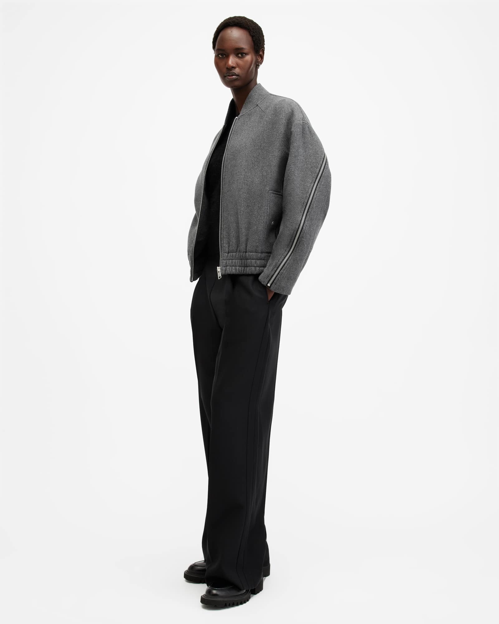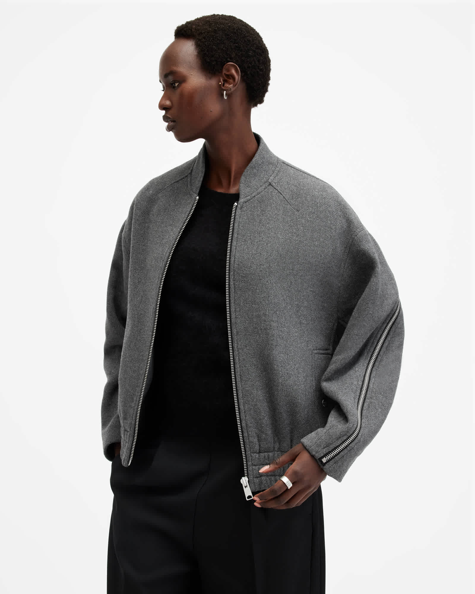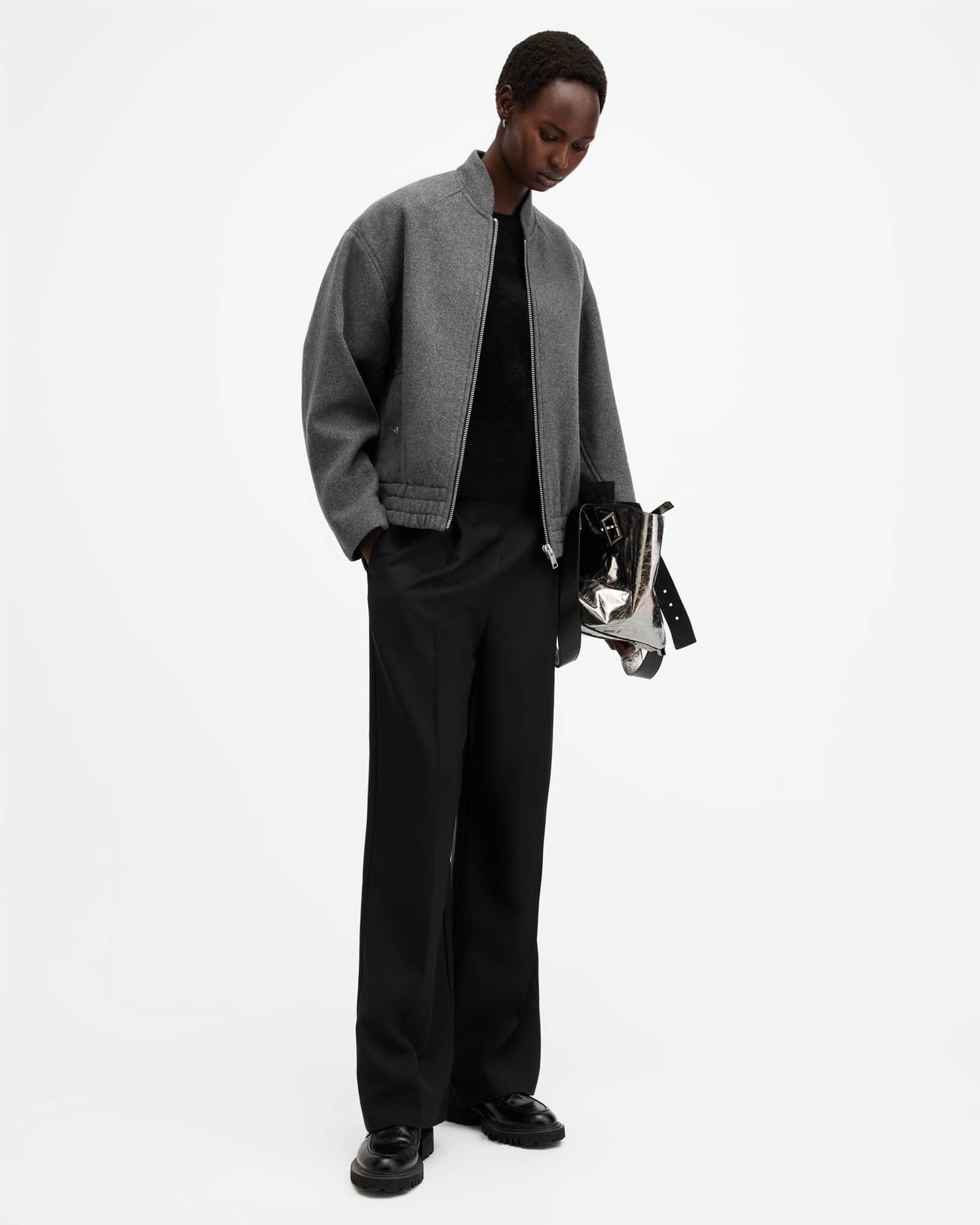 This jacket is designed to a regular fit that is true to size Zip closure Long sleeves Stand collar Dropped shoulders Elasticated waistband Two large pockets Asymmetric zipped back One interior pocket AllSaints jacquard lining Italian cloth - woven at the Manteco Mill.