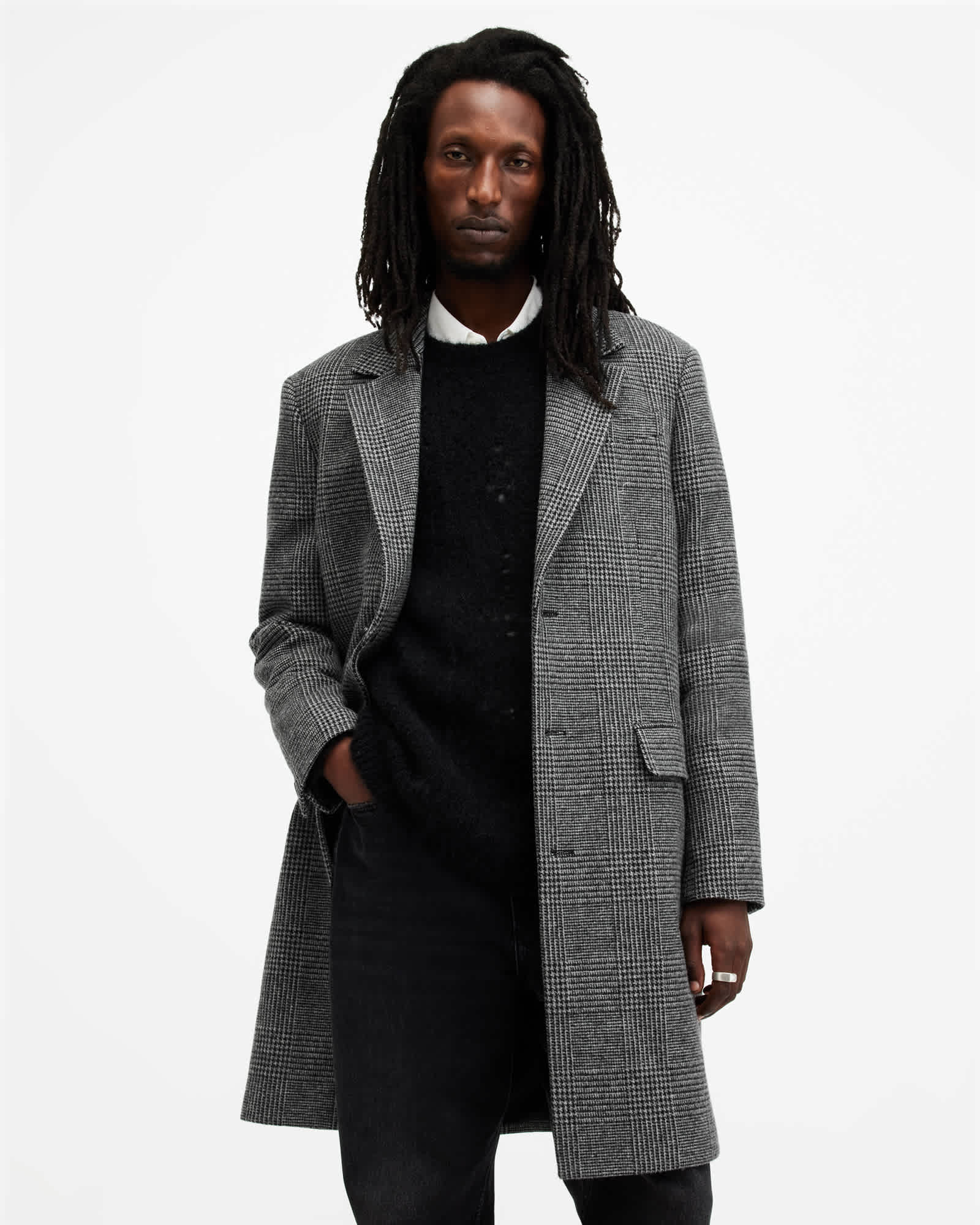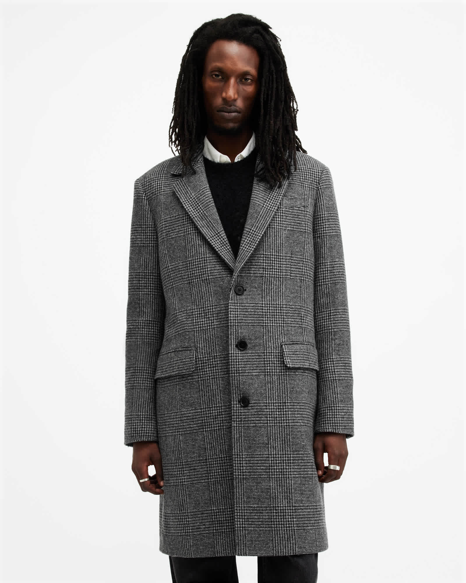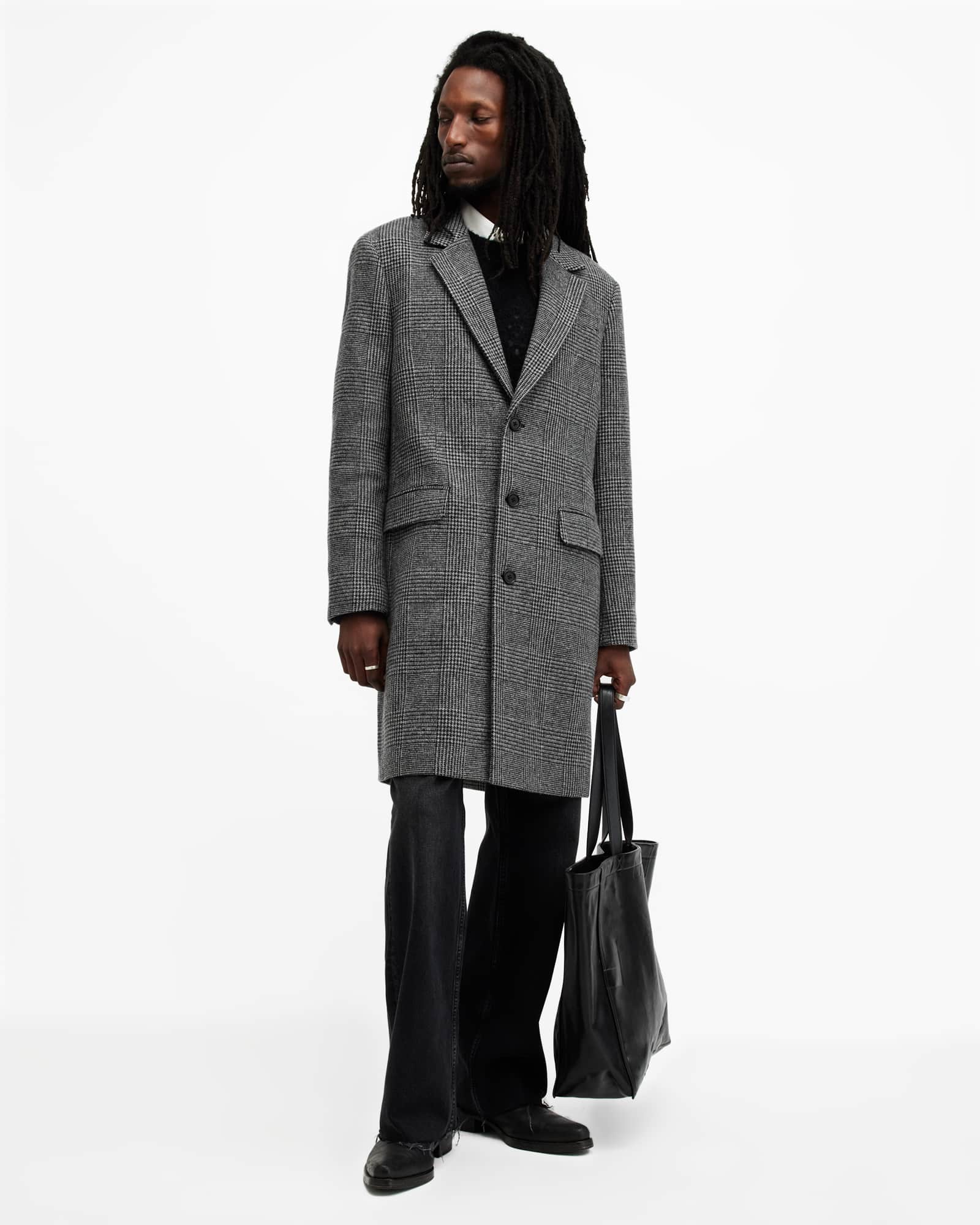 This coat is designed to a regular fit Button closure Long sleeves Notch collar Three button fastening Melton undercollar Vented hem Chest welt pocket Corozo buttons Leather hanging loop Prince of Wales check Lower front flap pockets One internal pocket Recycled fabrics Brushed fabric woven in Europe by Italian-inspired mill, Miroglio Lana.