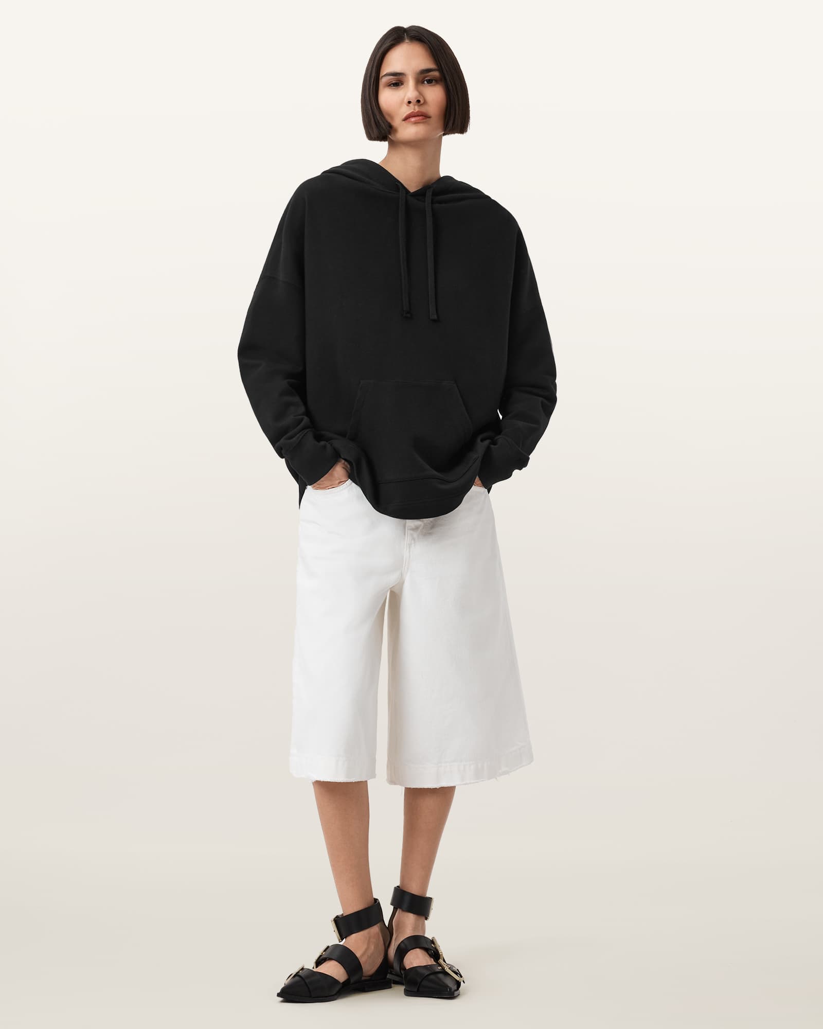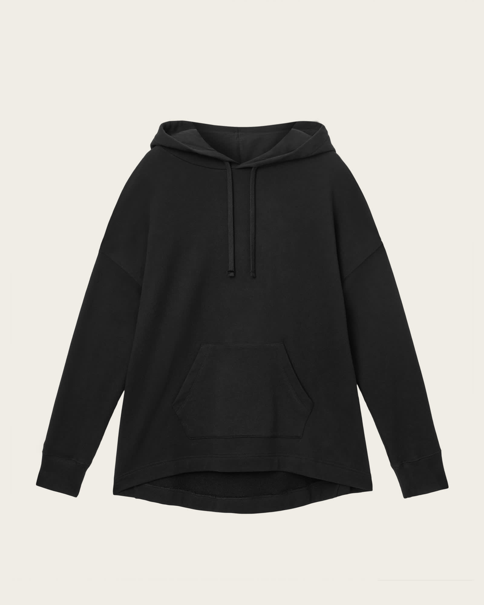 This hoodie is designed to an oversized fit Pullover Hooded Long sleeves with ribbed cuffs AllSaints branding on chest Front kangaroo pocket Scrunch graphic at back Heavyweight