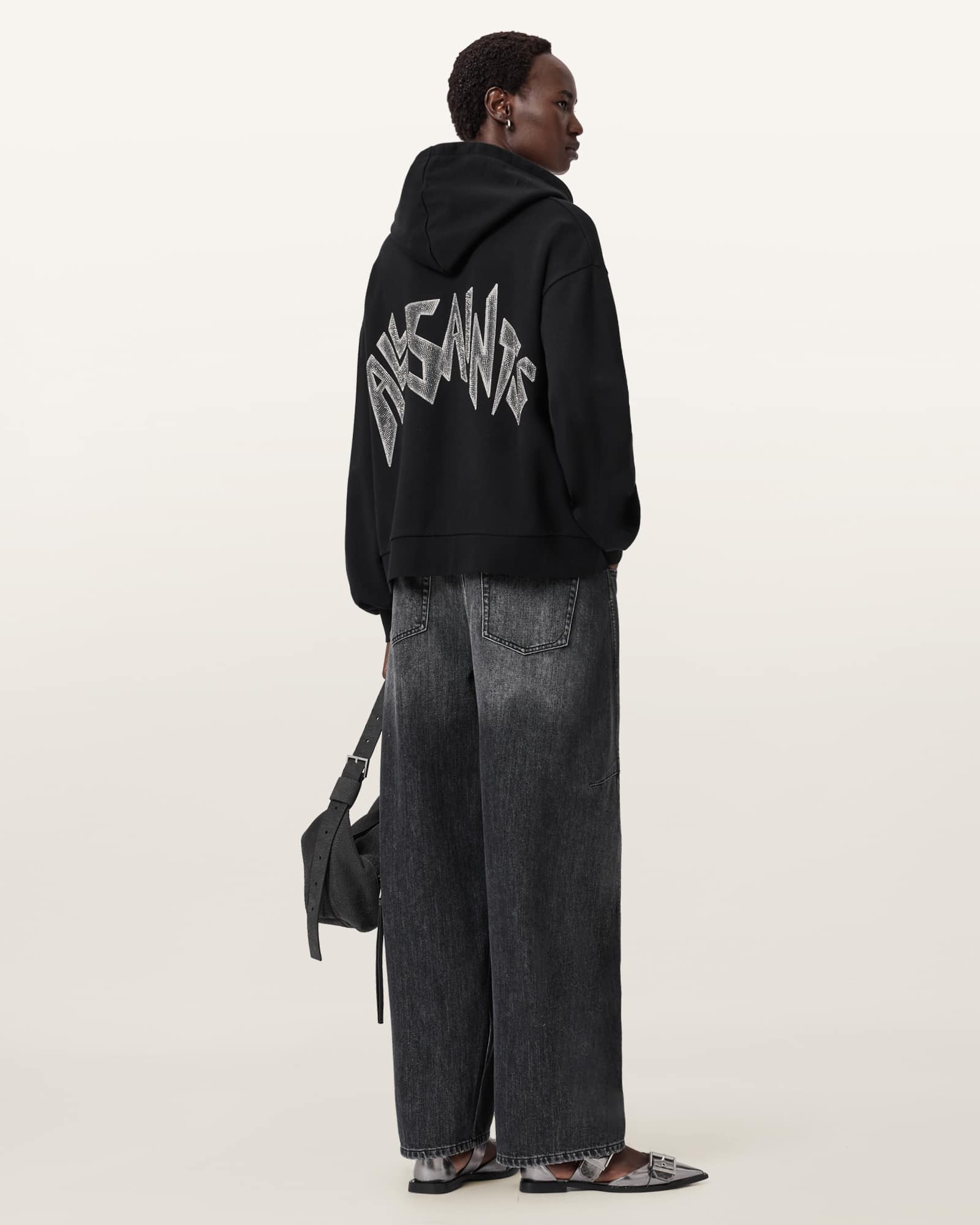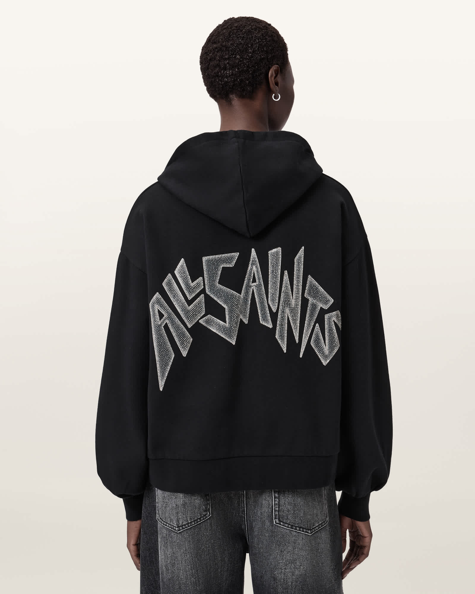 Pull over Hooded Long sleeves AllSaints branding Sparkly hotfix text Model is 5'11" and wearing size Medium, Pull over, Hooded , Long sleeves