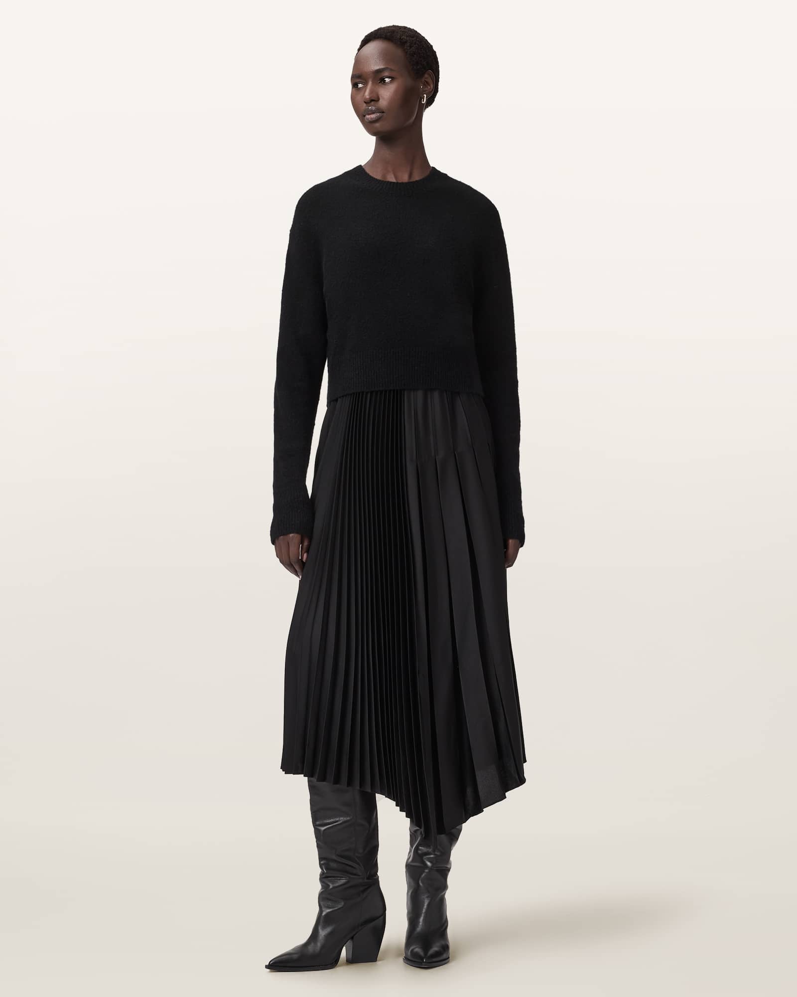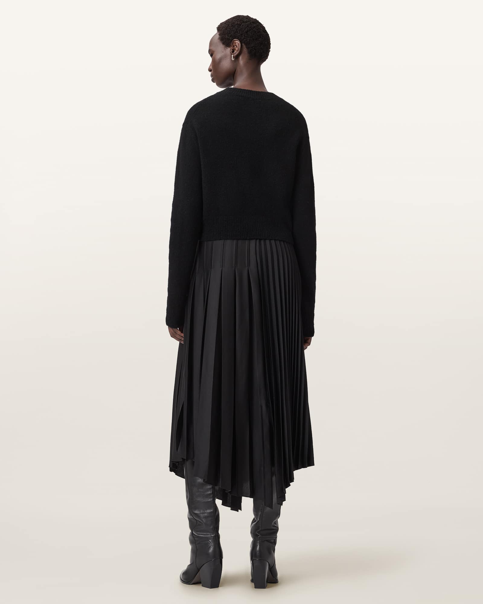 Pull on Removable jumper Pleated asymmetric skirt Adjustable straps The model is 5'11" and wearing size Small
