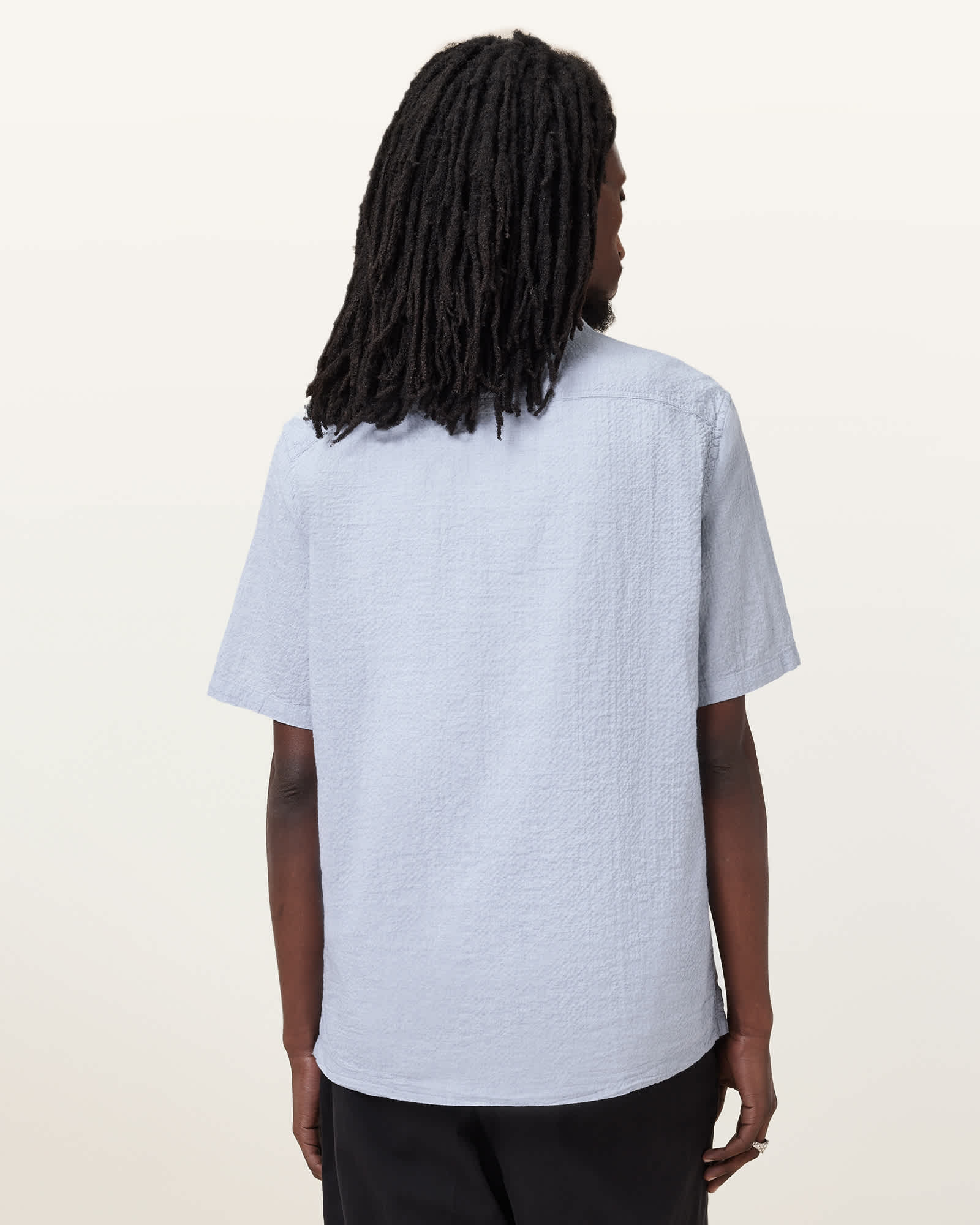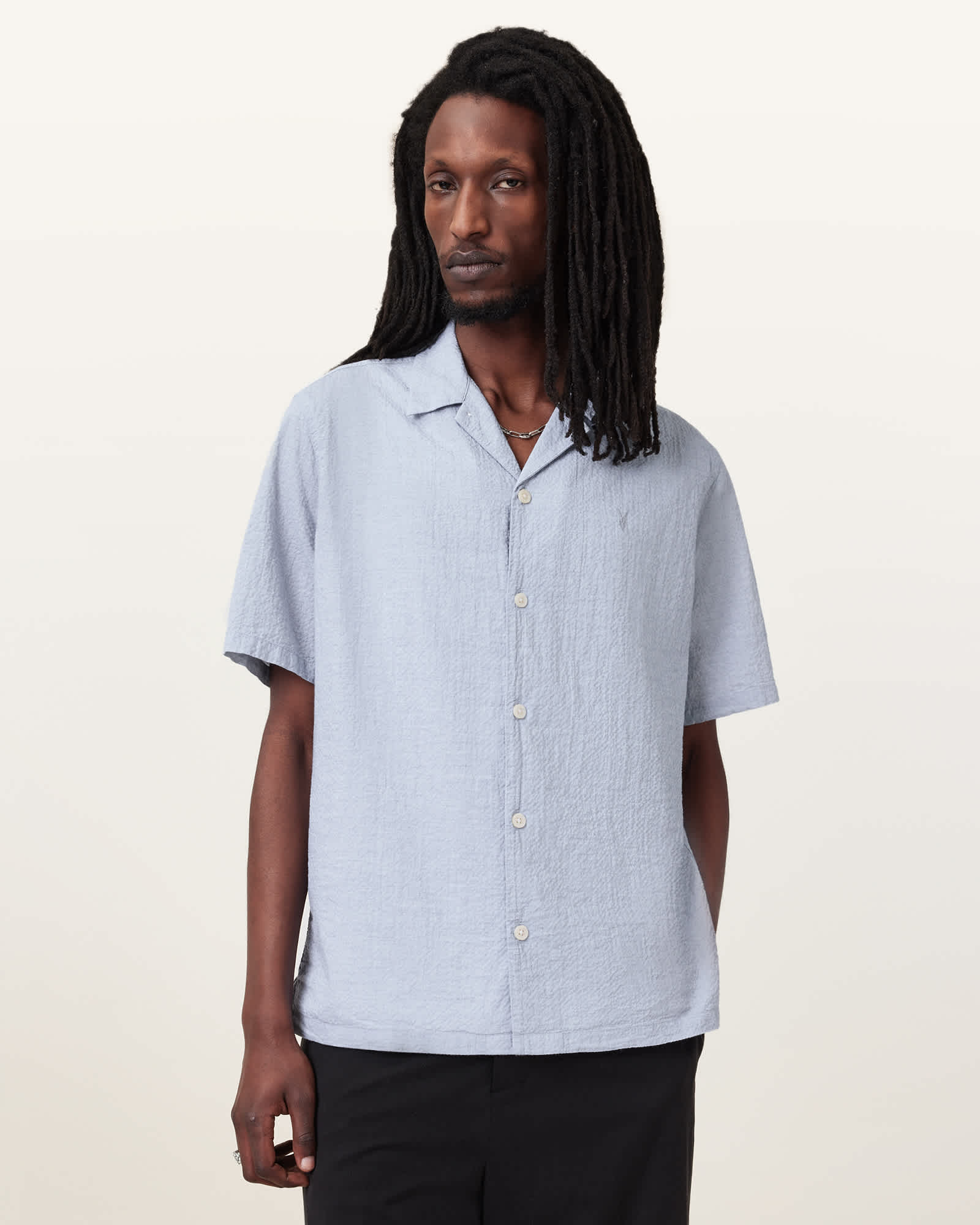 This shirt is designed to a relaxed fit Button closure Resort collar Short sleeves Ramskull embroidery Straight hem Seersucker stretch cotton