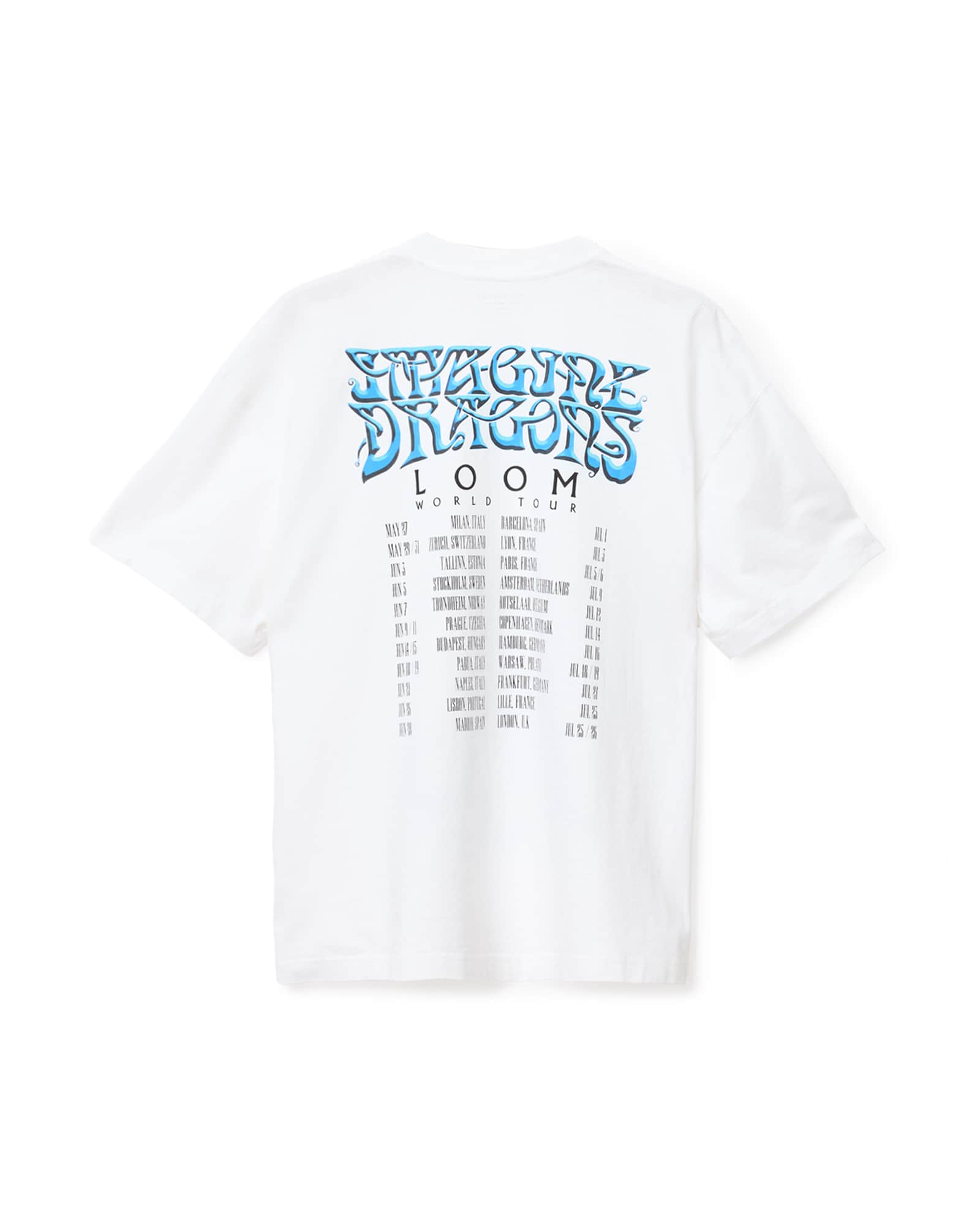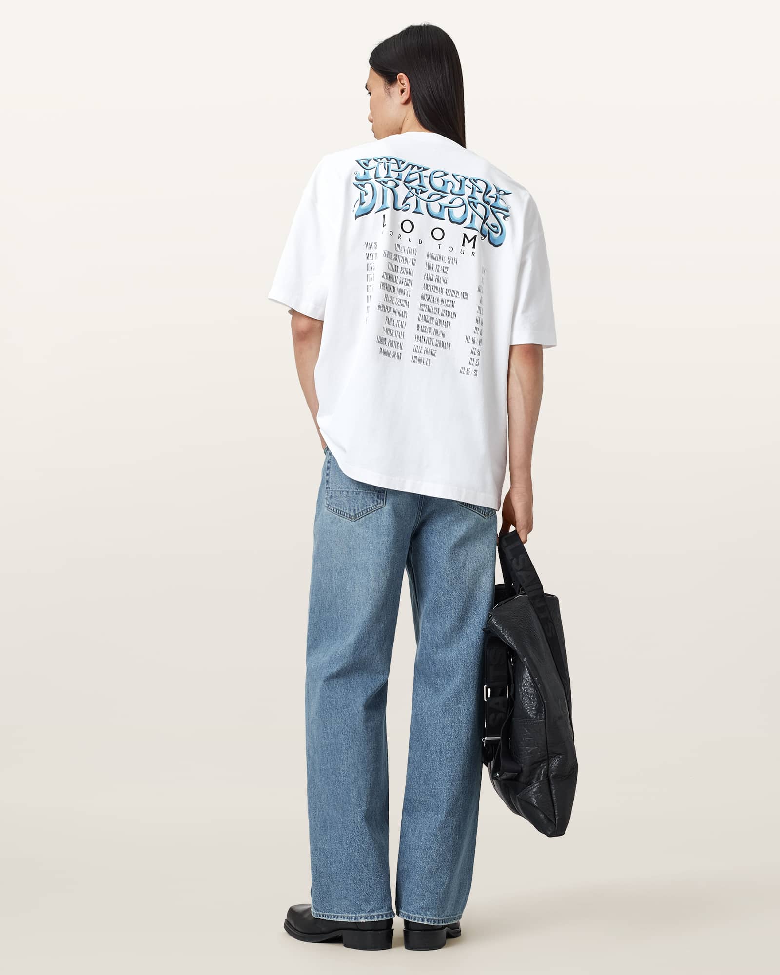 This T-shirt is designed to an oversized fit Exclusive All Saints X Imagine Dragons collaboration Crew neck Short sleeves Twin needle stitch detailing All Saints X Imagine Dragons airbrush branding Dragon and skeleton jester illustration Loom World Tour 2025 dates printed at back Heavyweight