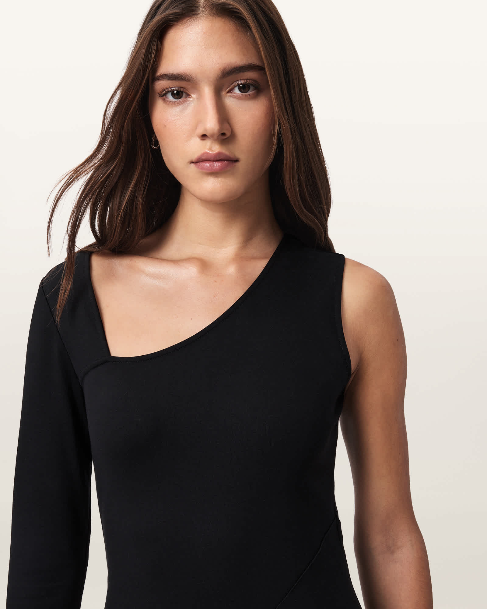 Pull on One sleeve Asymmetric neckline Curved seam The model is 5'9.5" and wearing size UK 8Measurements (from side neck point to hem):