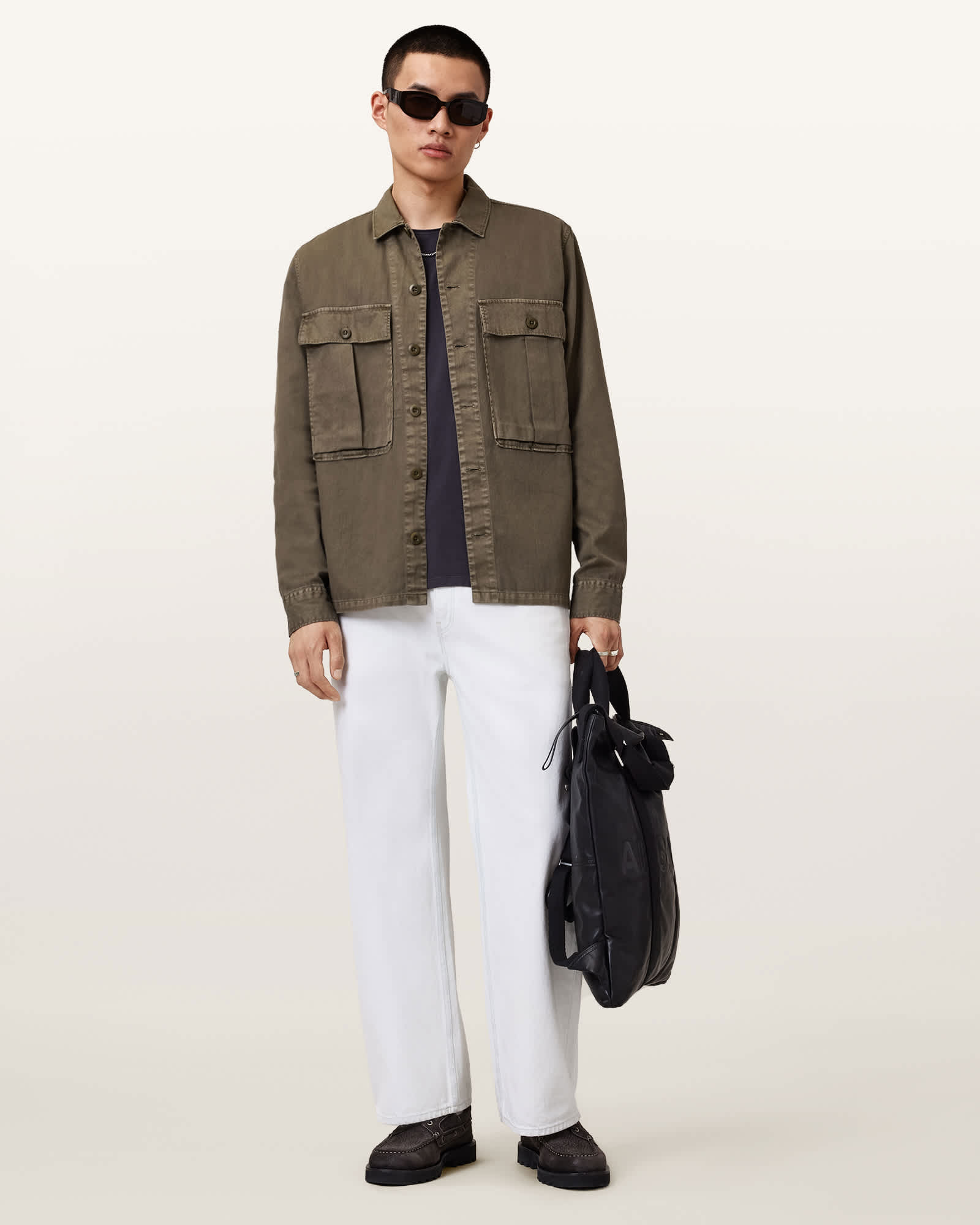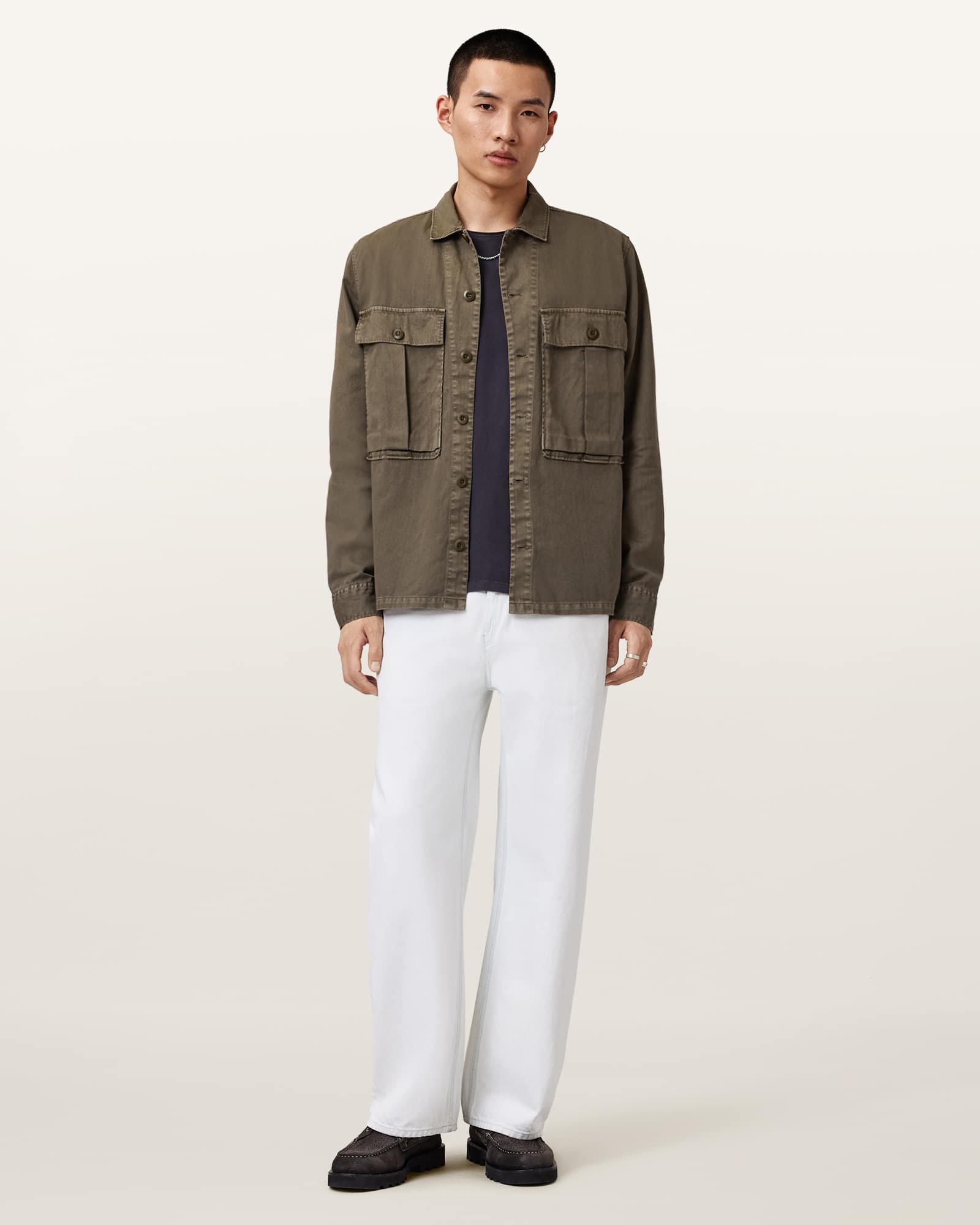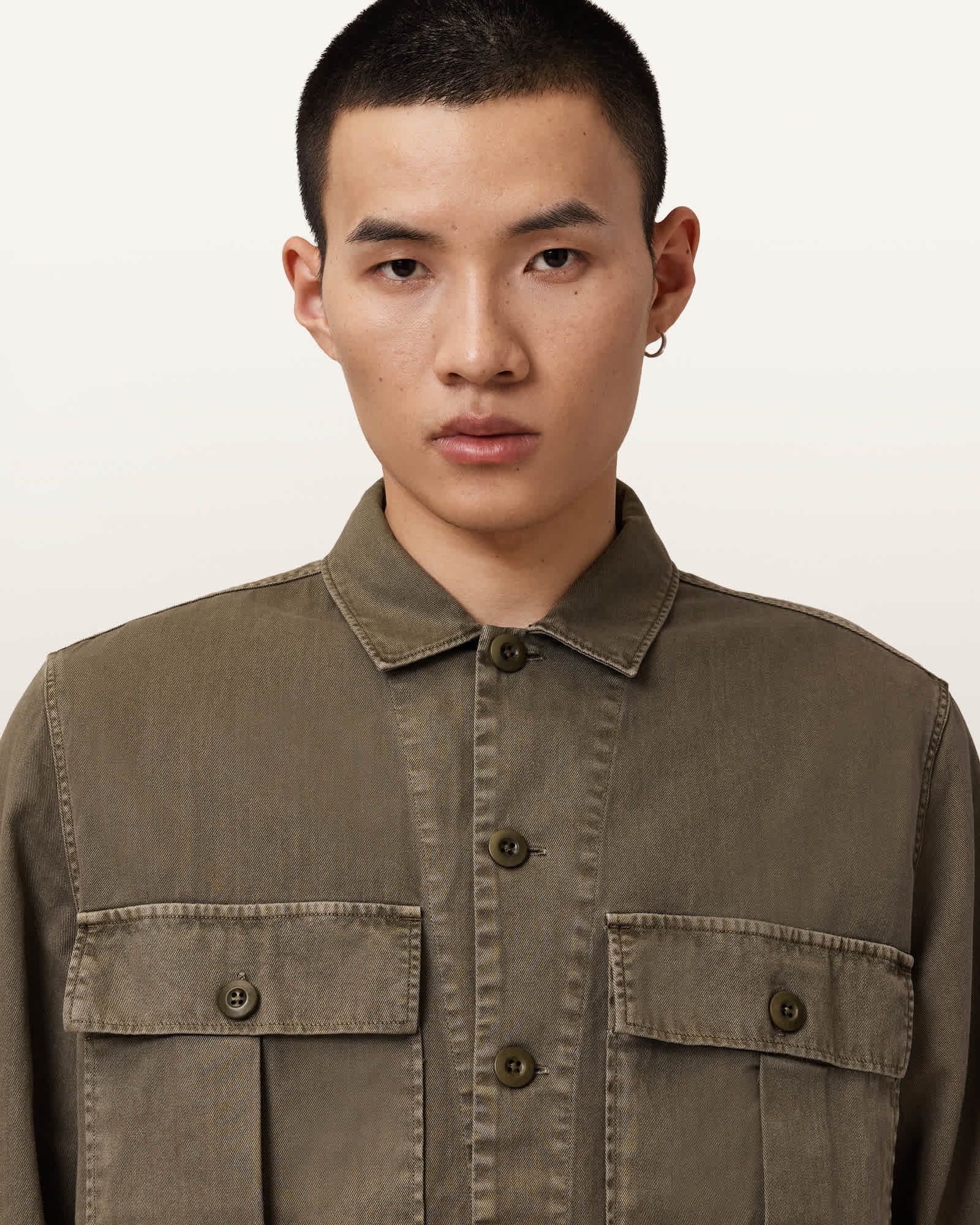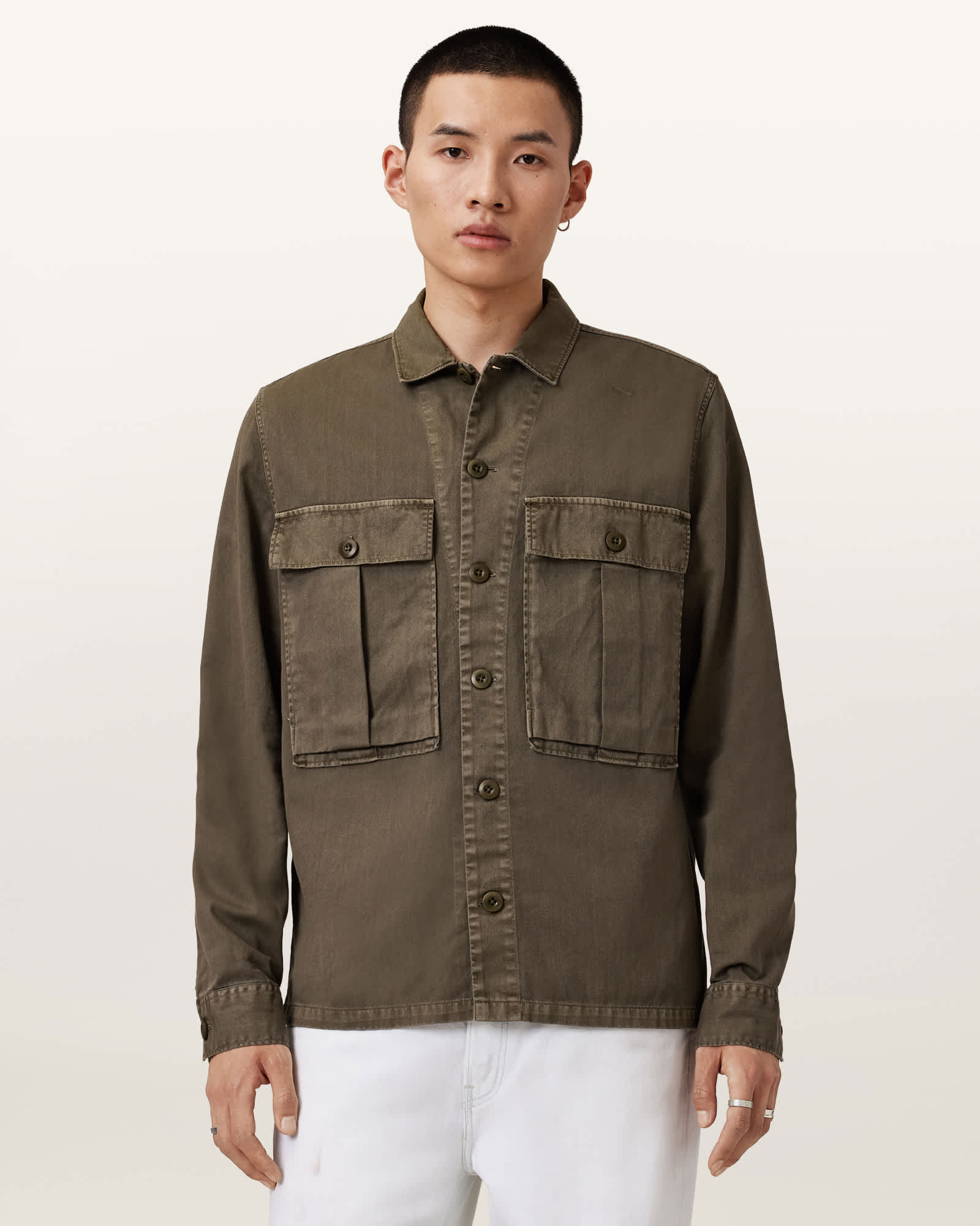 This shirt is designed to a relaxed fit Button closure Classic collar Long sleeves Two military style pockets