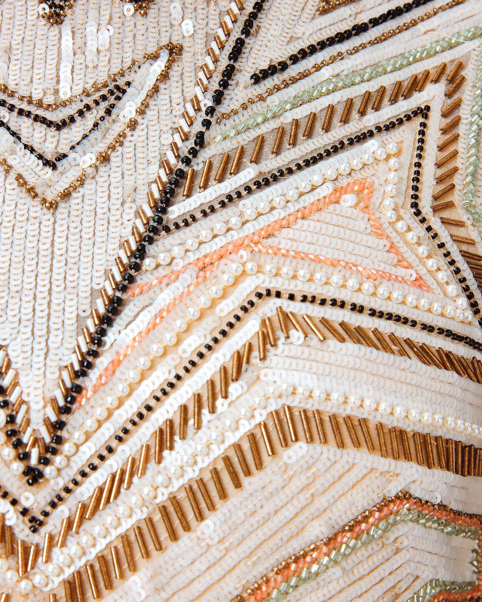 This dress is designed to a regular fit Zip closure Mini length Round neck Long sleeves Slip lining Bead embellishments
