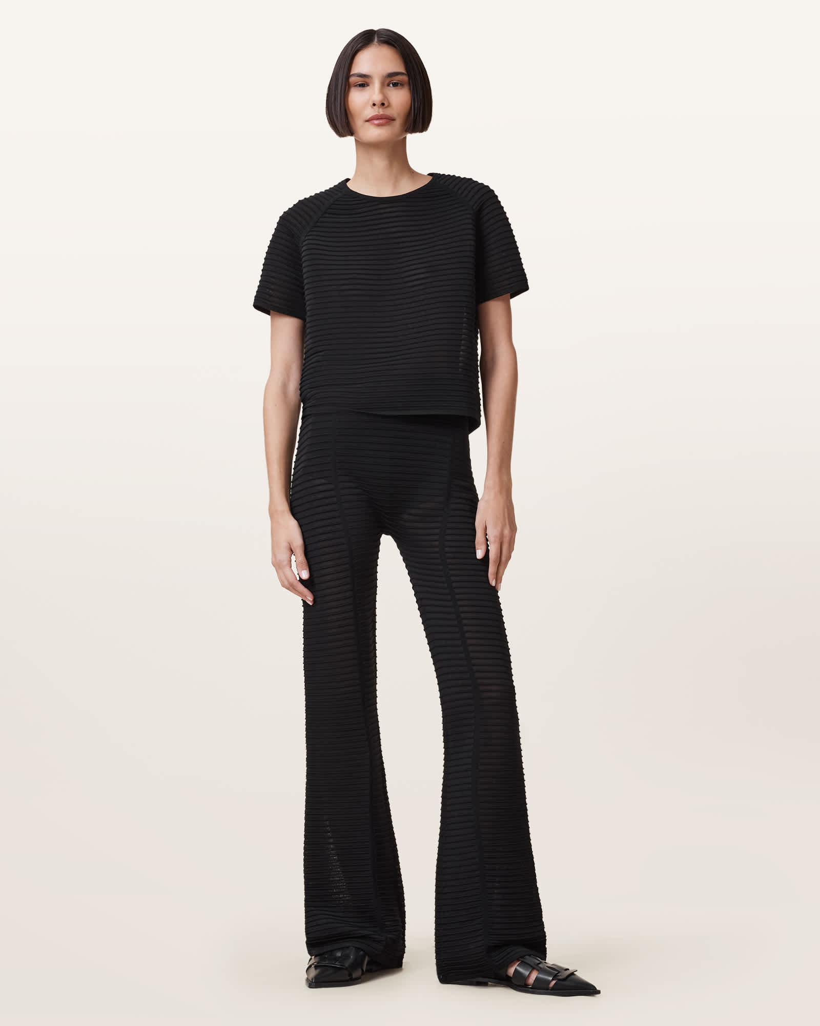 These trousers are designed for a slim fit Pull on Flared hem Ripple stitch technique Sheer and opaque stripes Mid rise Style with the matching Alice T-shirt