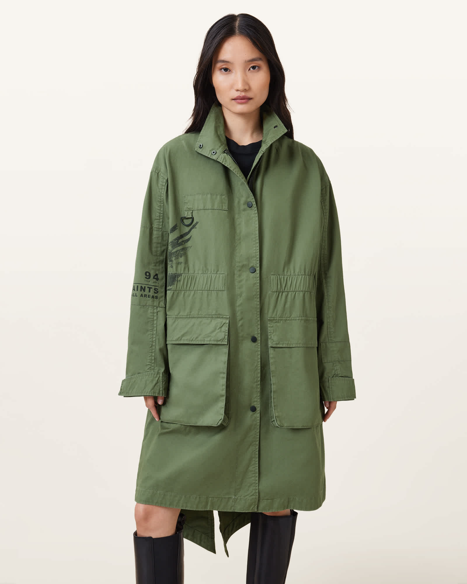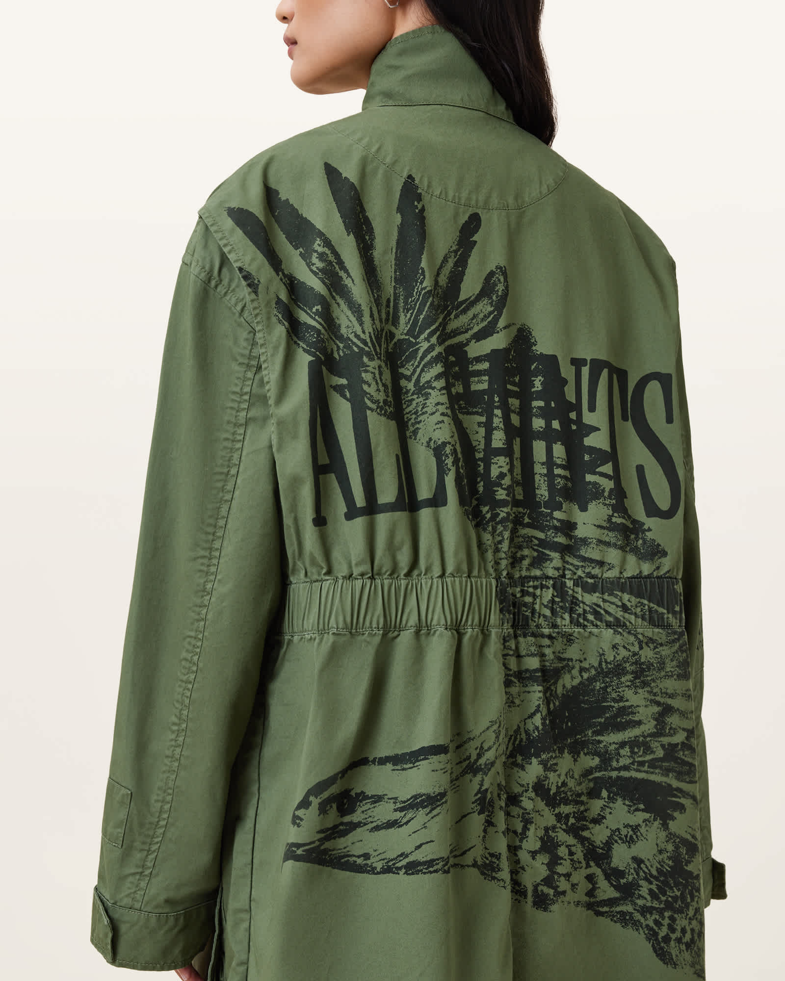 AllSaints Milla Bird Print Parka Jacket,, Khaki Green | ricciano CANADA