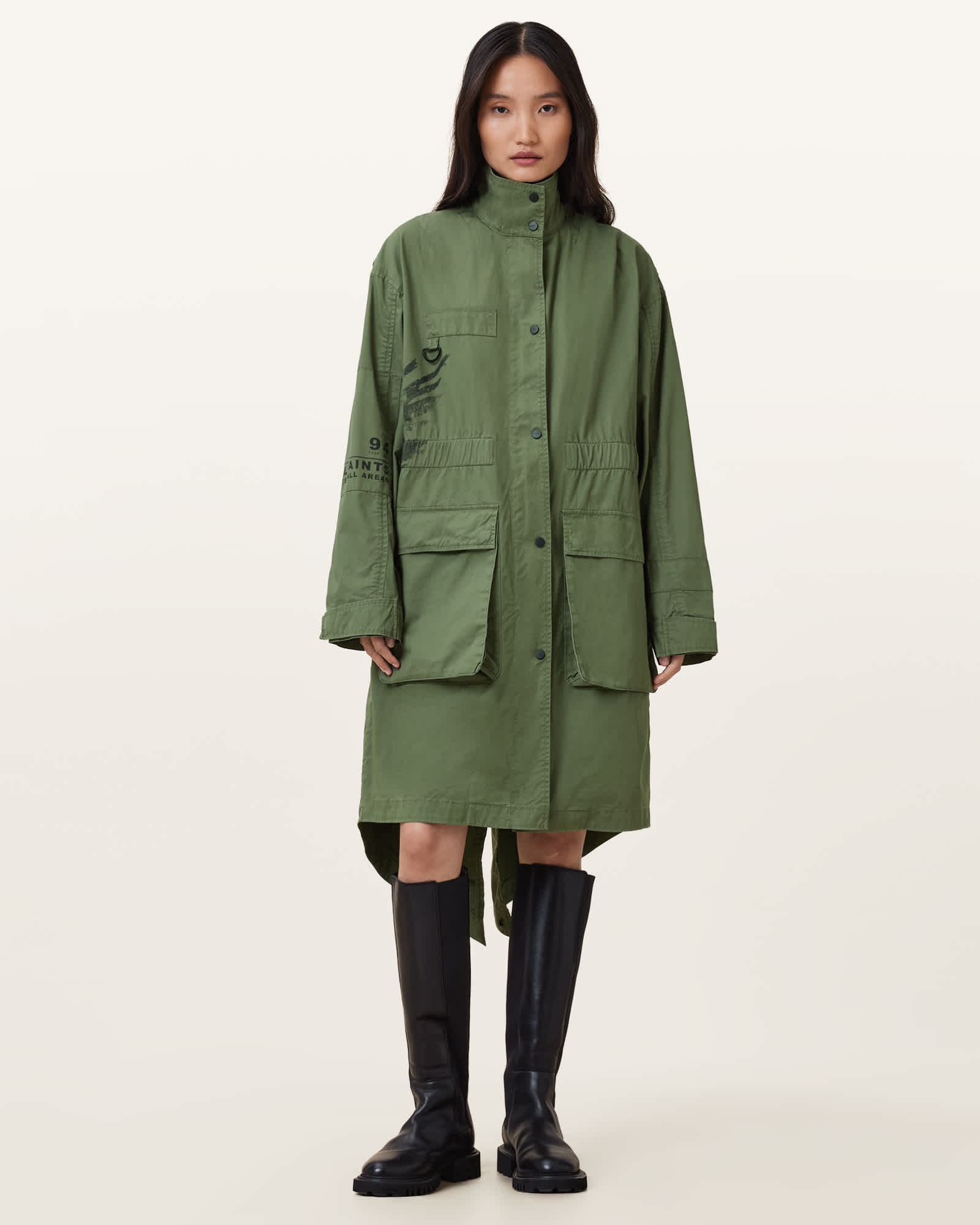 AllSaints Milla Bird Print Parka Jacket,, Khaki Green