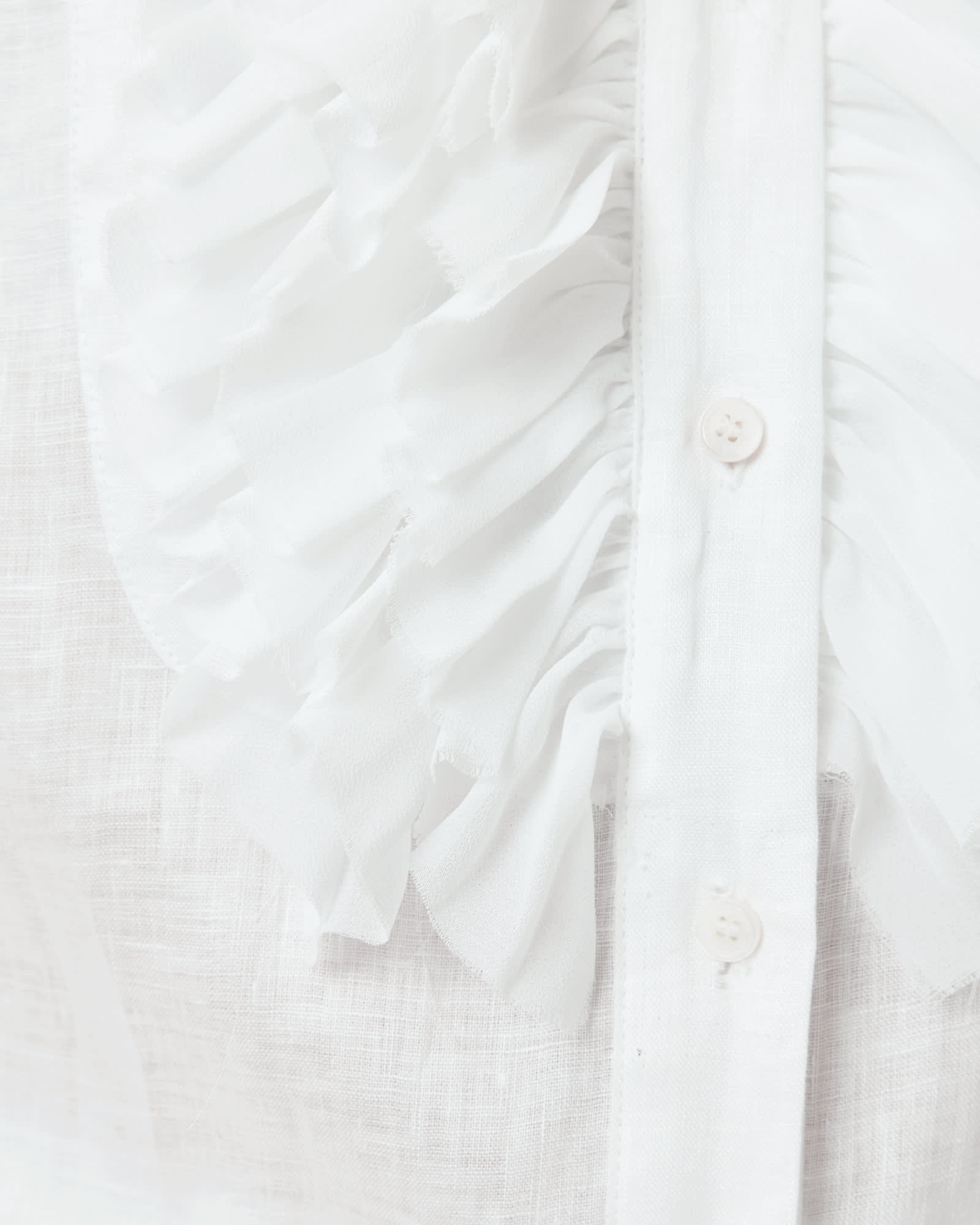 This shirt is designed to a regular fit Button closure Stand collar Long sleeves Ruffled bib front Dropped shoulders High-low hem Unlined