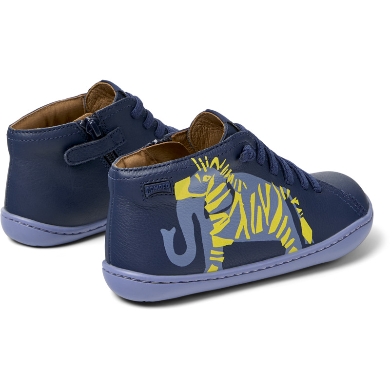 CAMPER - Blauw met gele kalfsleren kinder-enkelboots met EVA-voetbed, elastische veters en rubberen buitenzool.