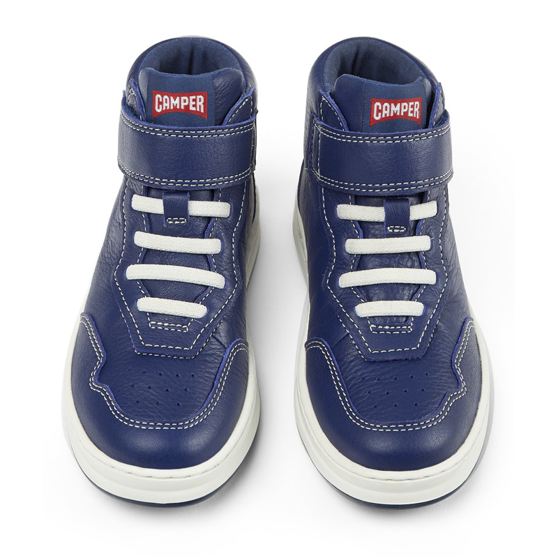CAMPER - Blauwe leren kindersneakers met klittenbandsluiting, uitneembaar OrthoLite® voetbed en 100% rubberen buitenzool Onze Runner kindersneakers zijn een miniatuurversie van ons originele sportmodel dat het licht zag in 1992.