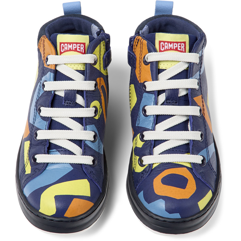 CAMPER - Multi-colored leather and recycled polyester boots for kids with OrthoLite® removable footbed and 100% rubber outsoles Born in 1988, our classic TWINS concept — opposite yet complementary - challenges the idea that shoes must be identical and lives on in these mismatched kids´ shoes to form a truly unique pair.