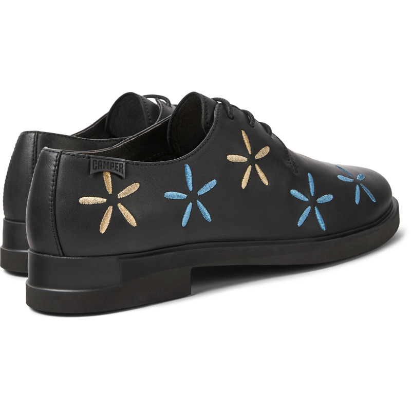 CAMPER - Black leather women's shoes with embroidered flowers, OrthoLite® Recycled™ non-removable footbeds, and XL EXTRALIGHT® outsoles.