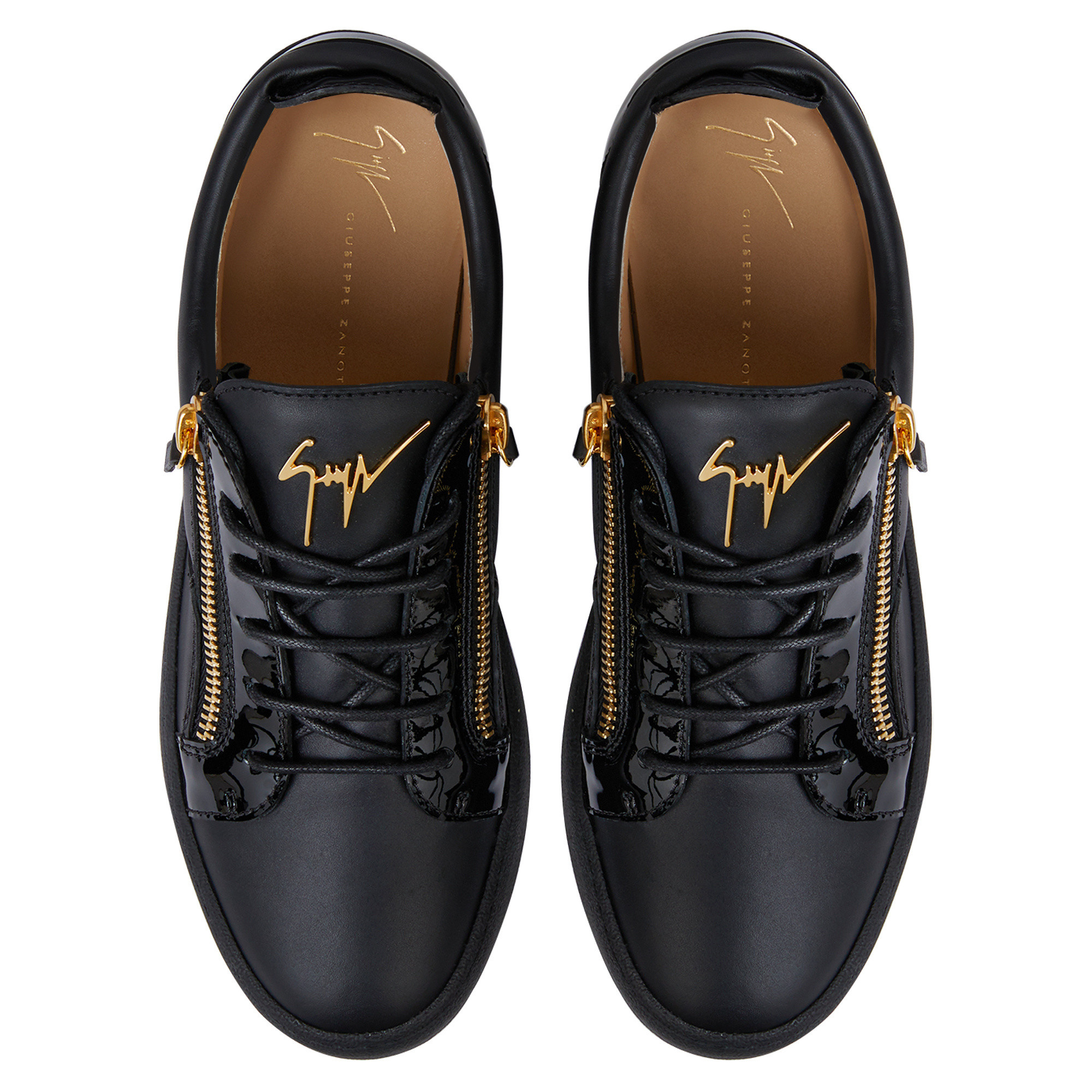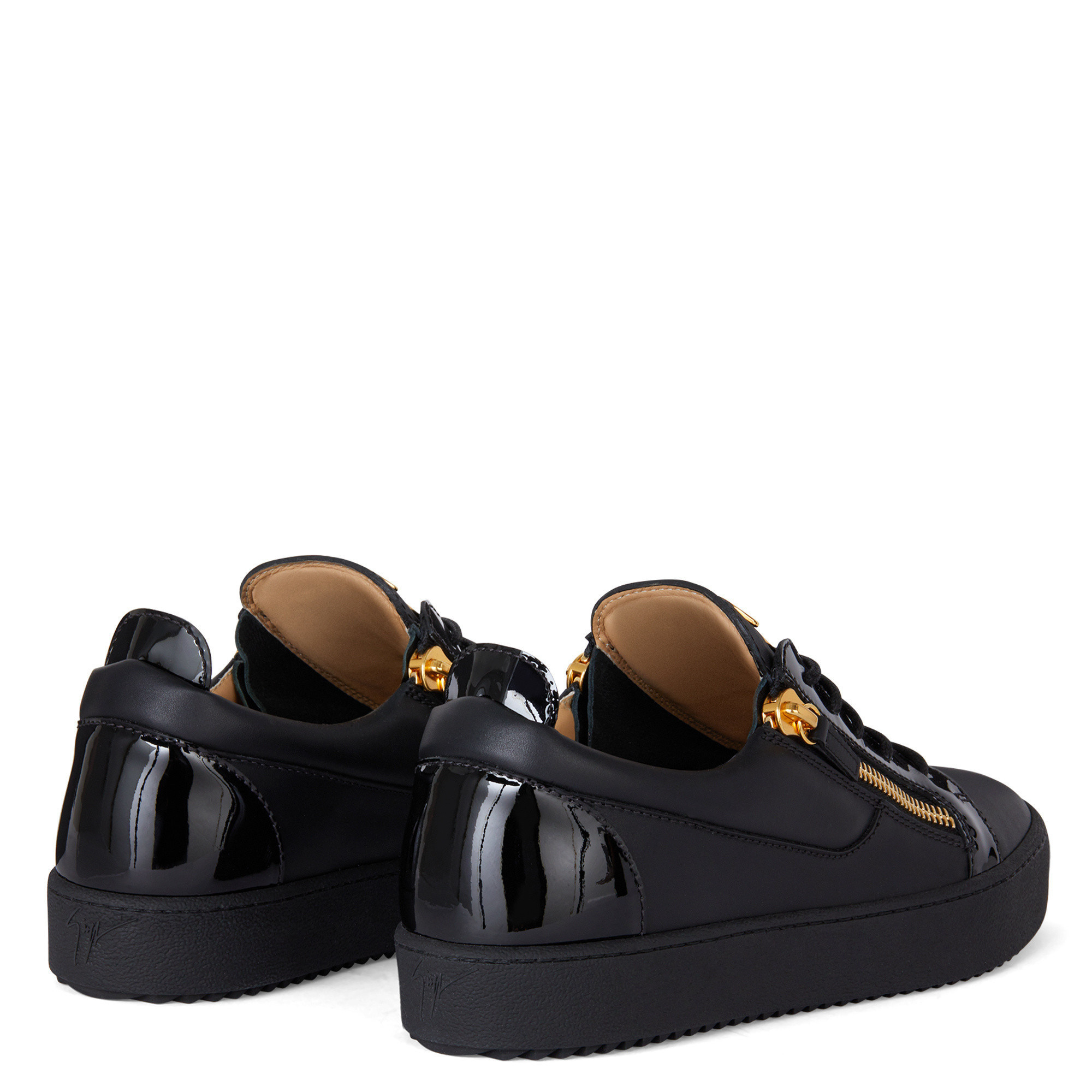 Low-top lace-up sneakers in leather and patent leather with two side zips and rubber sole.