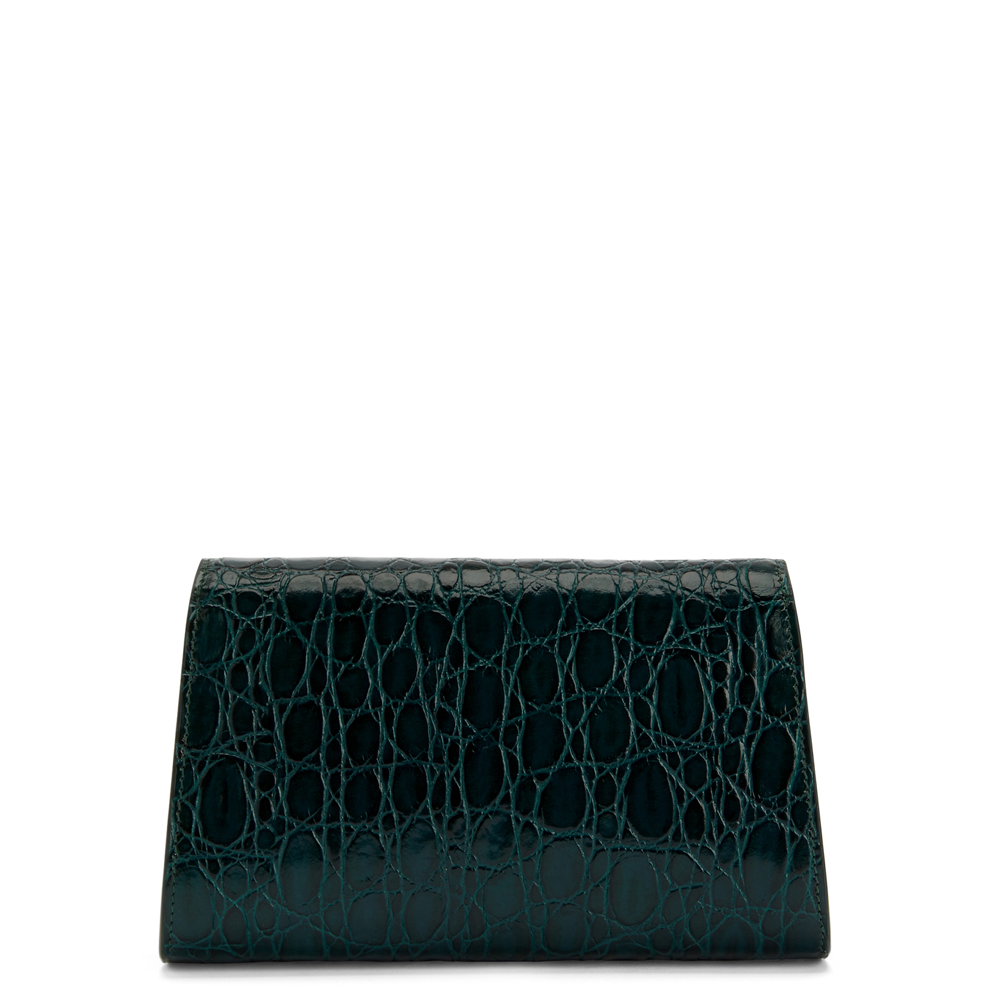Crocodile-print leather clutch bag with metal detail, chain shoulder strap, pocket and inner card slots.