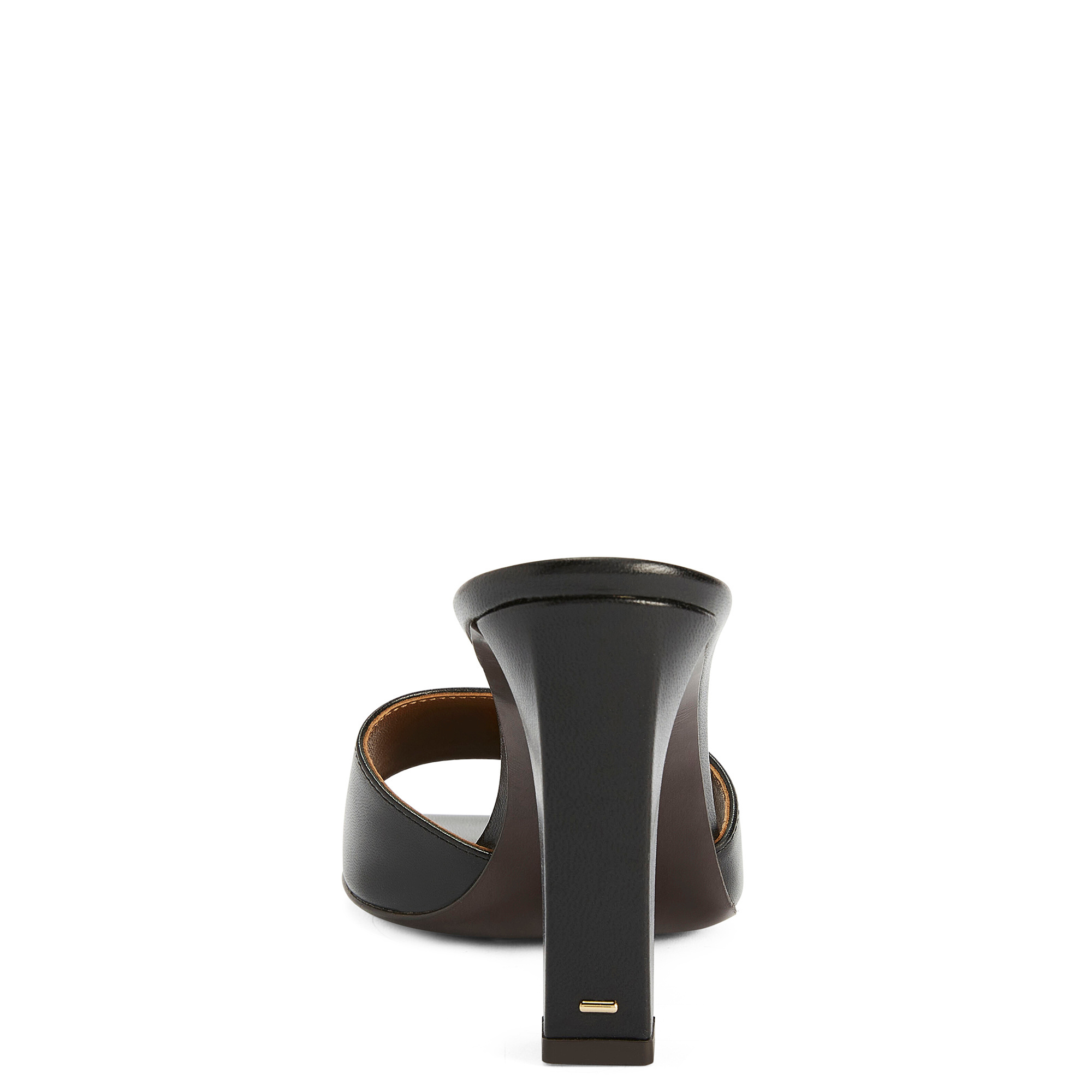 Open-toe mule sandals in leather with square toe and block heel with metal stitch detail.