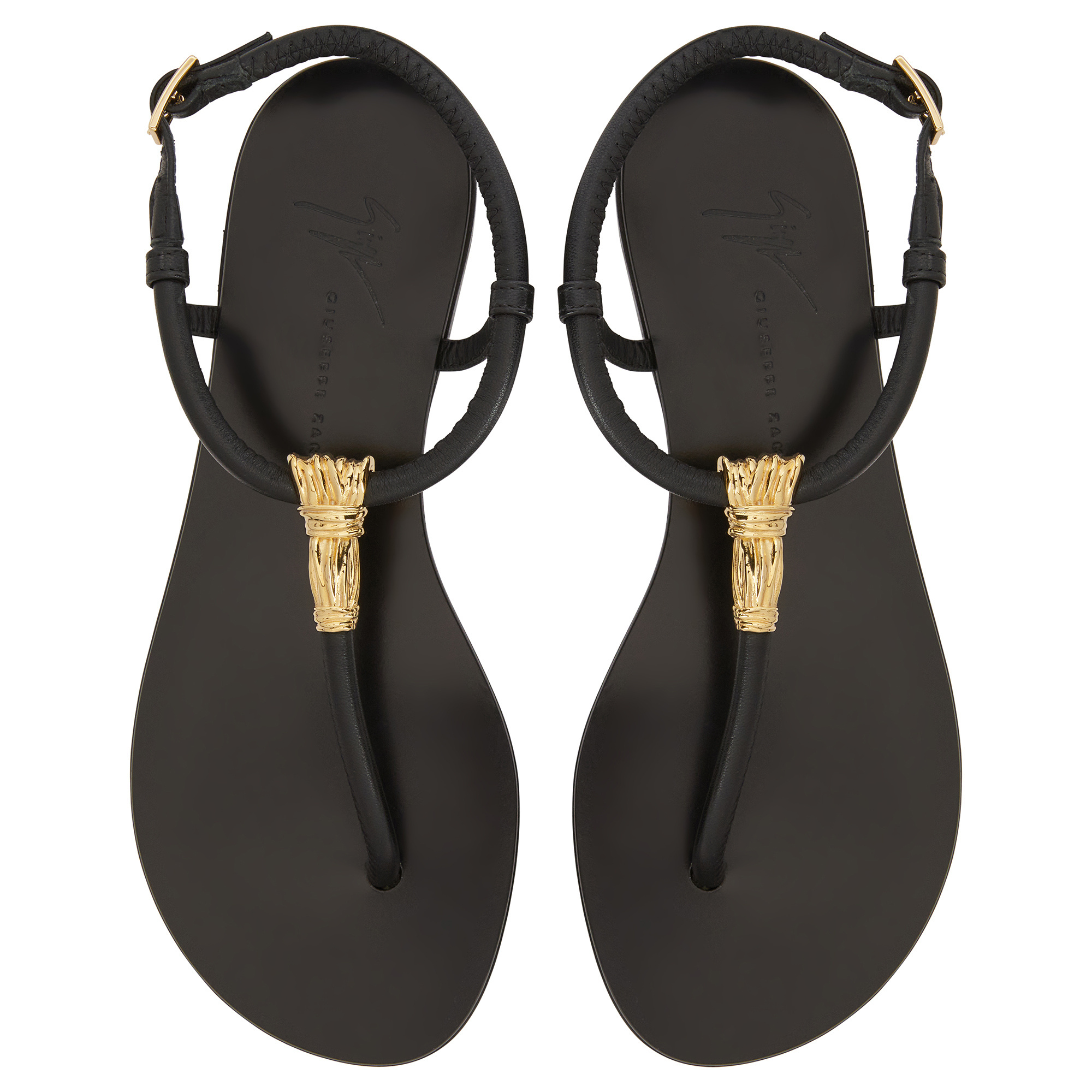 Flat thong sandals in leather with metal accessory and buckle-adjustable strap.