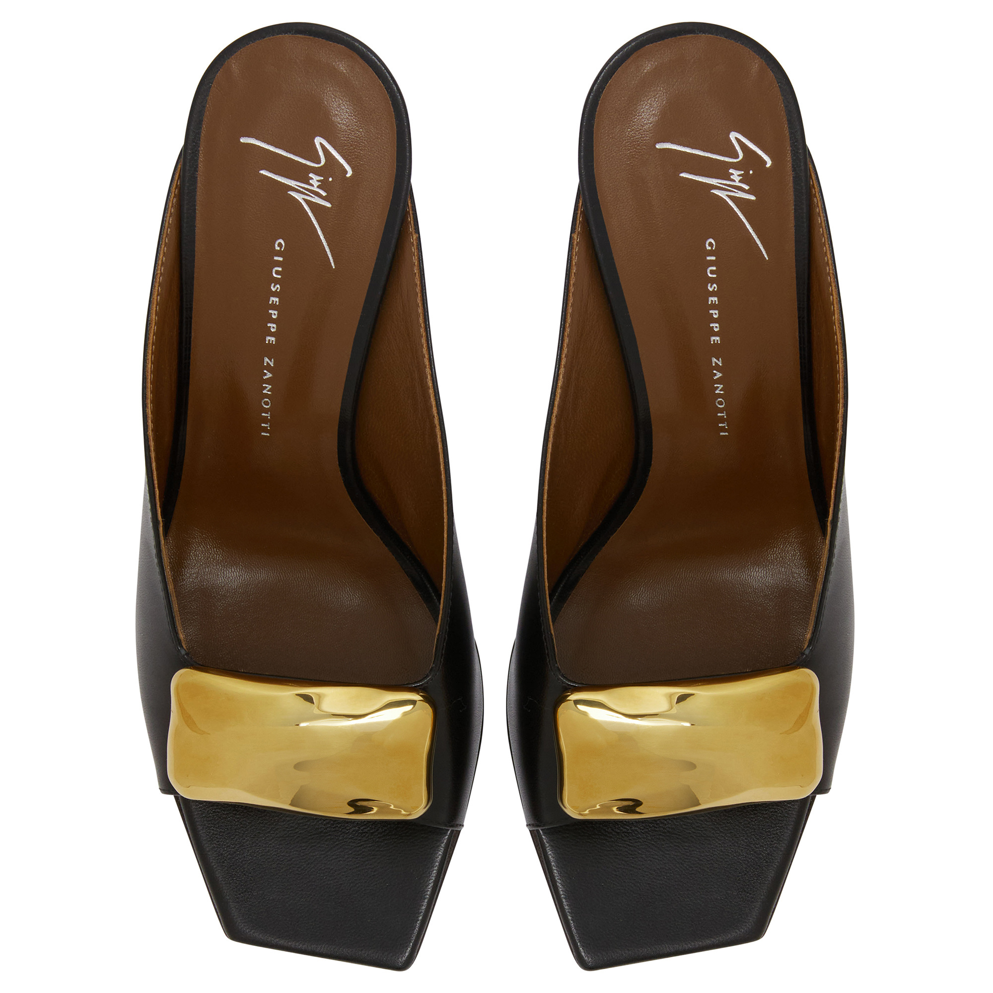 Clean-cut, open-toe mule sandals in leather with square toe and topline, geometric metal brooch and block heel.
