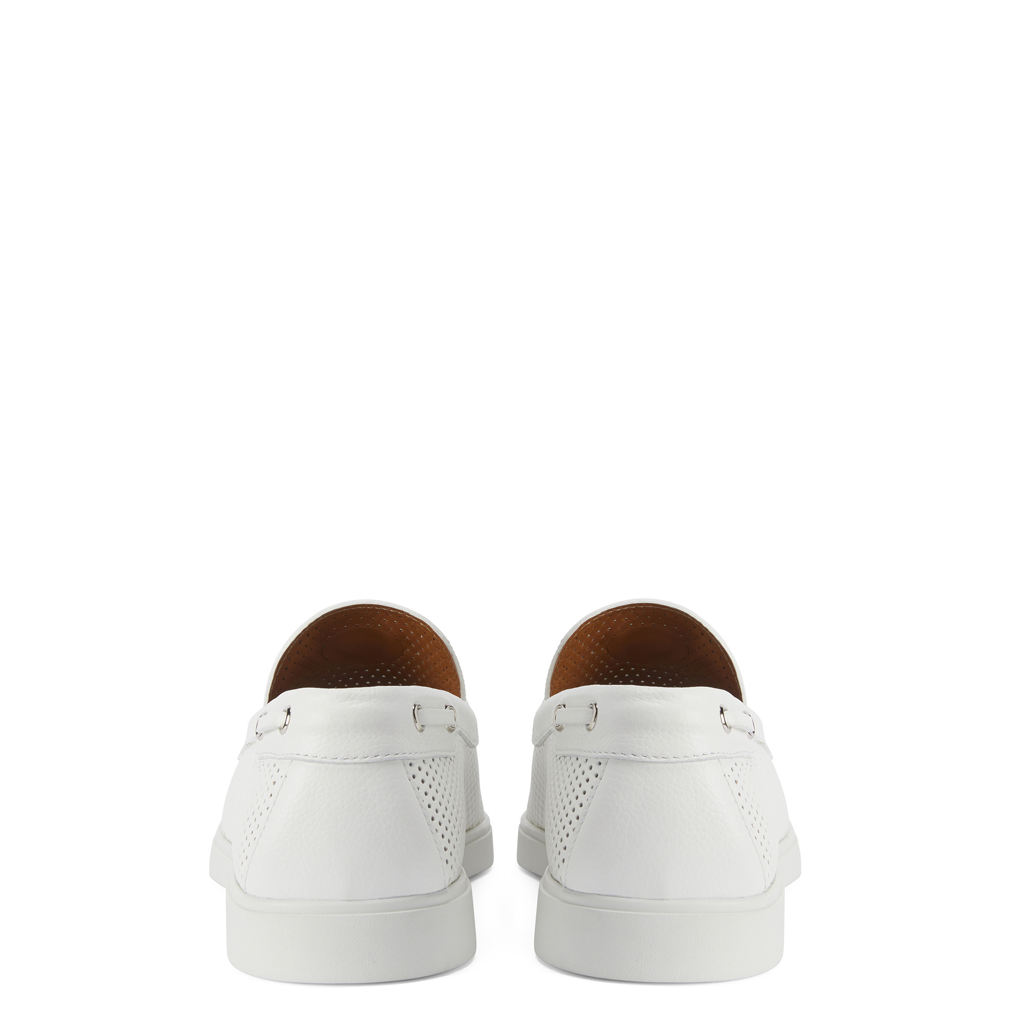 Leather moccasins with perforations, threading, metal Signature detail on the tongue and rubber sole.