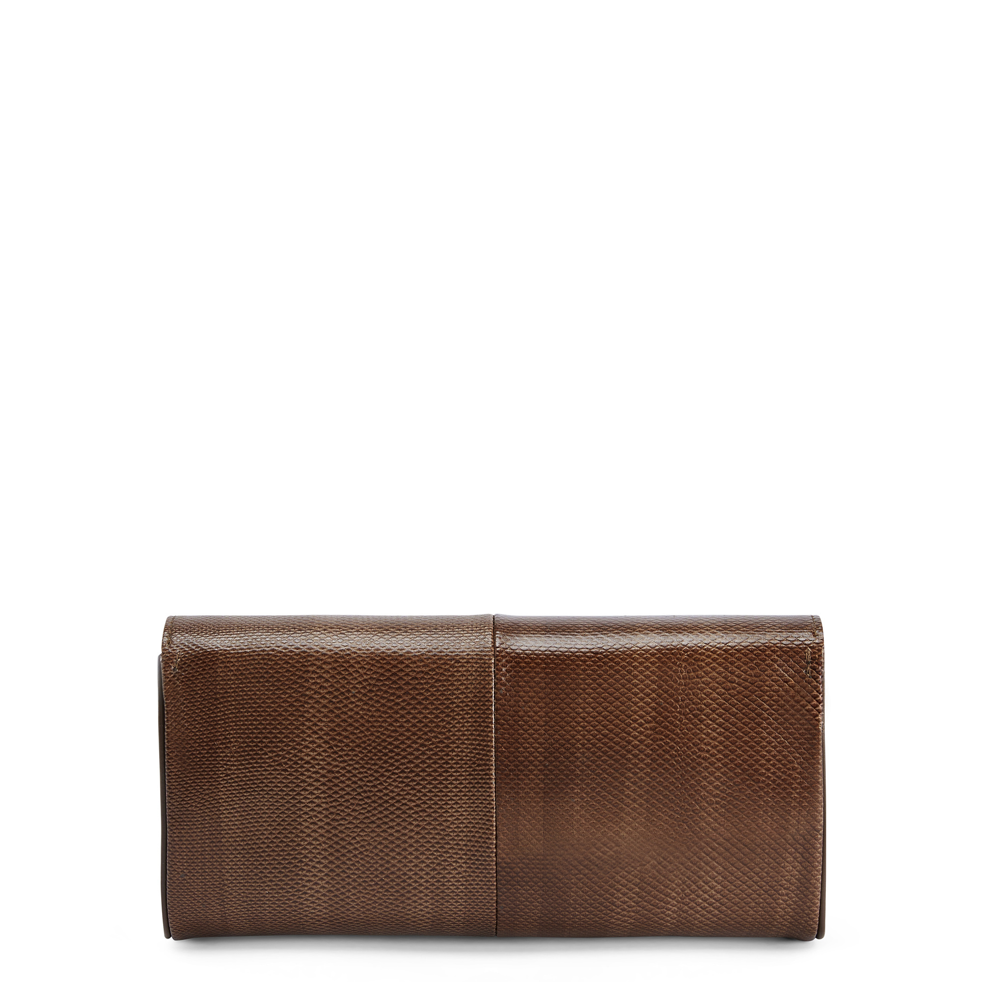 Clutch bag in karung skin with branded metal closure, chain shoulder strap, pocket and inner card slots.