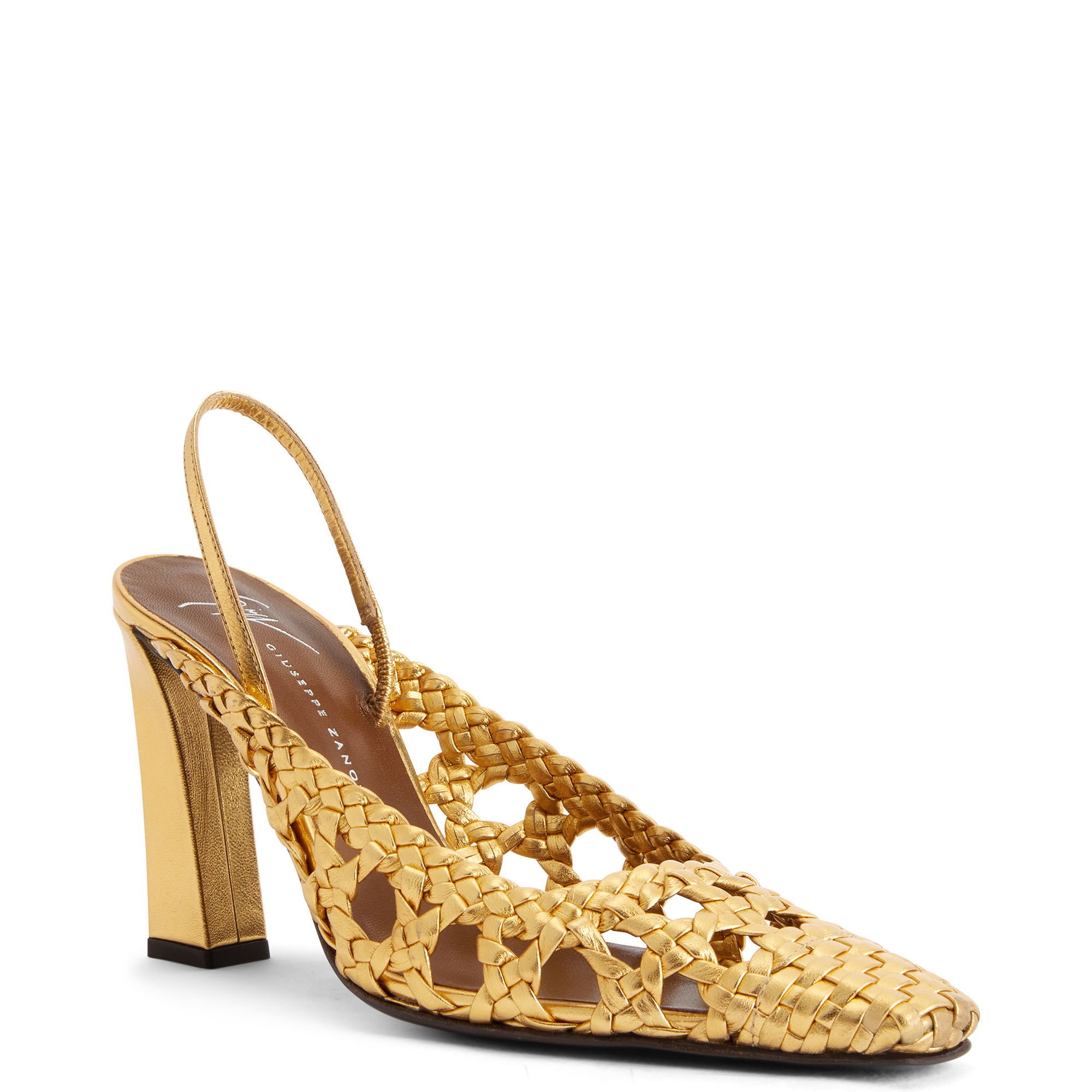 Slingback pumps in woven leather with square topline and toe, rear strap with elastic insert and block heel with metal stitch detail.