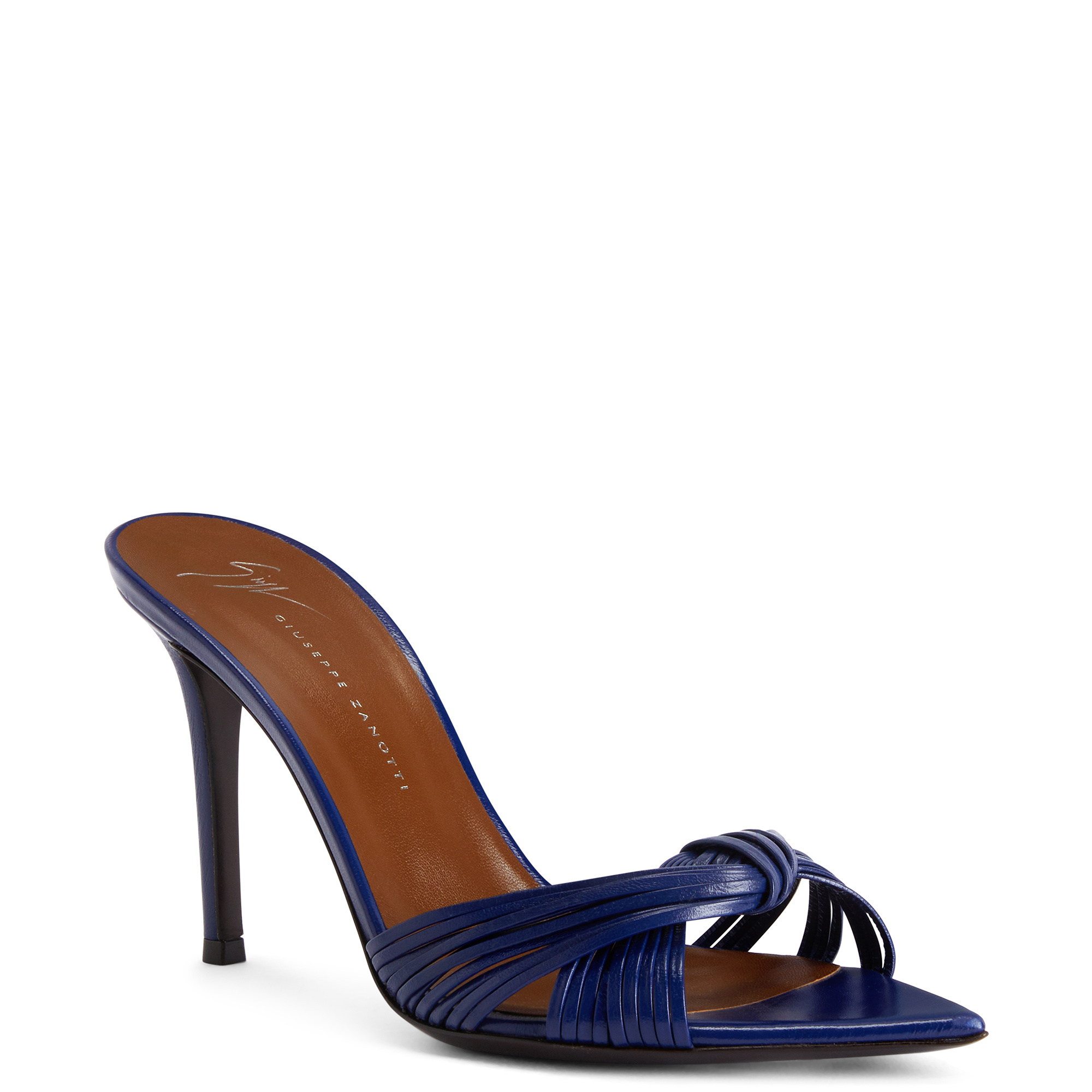 Pointed open-toe mule sandals in leather with thin knotted strips and stiletto heel.