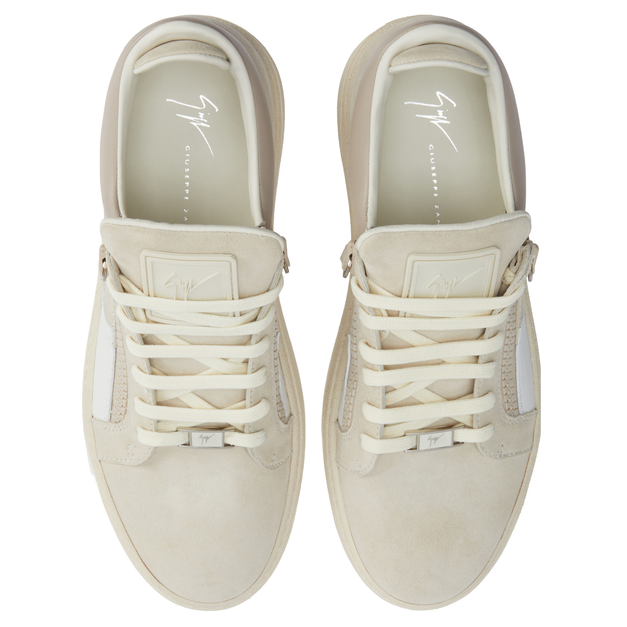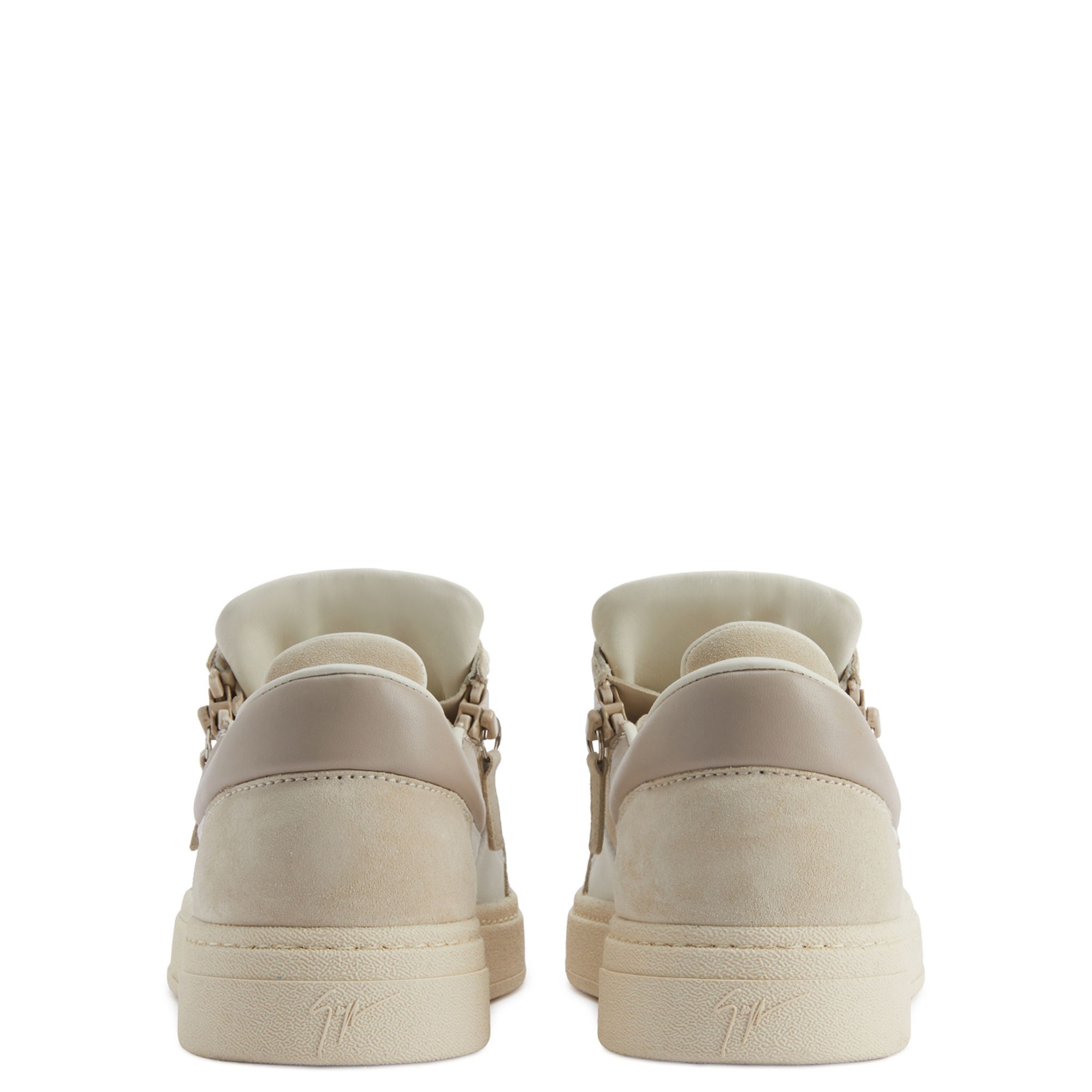Low-top lace-up sneakers in leather and suede leather with two tonal side zippers and rubber sole.