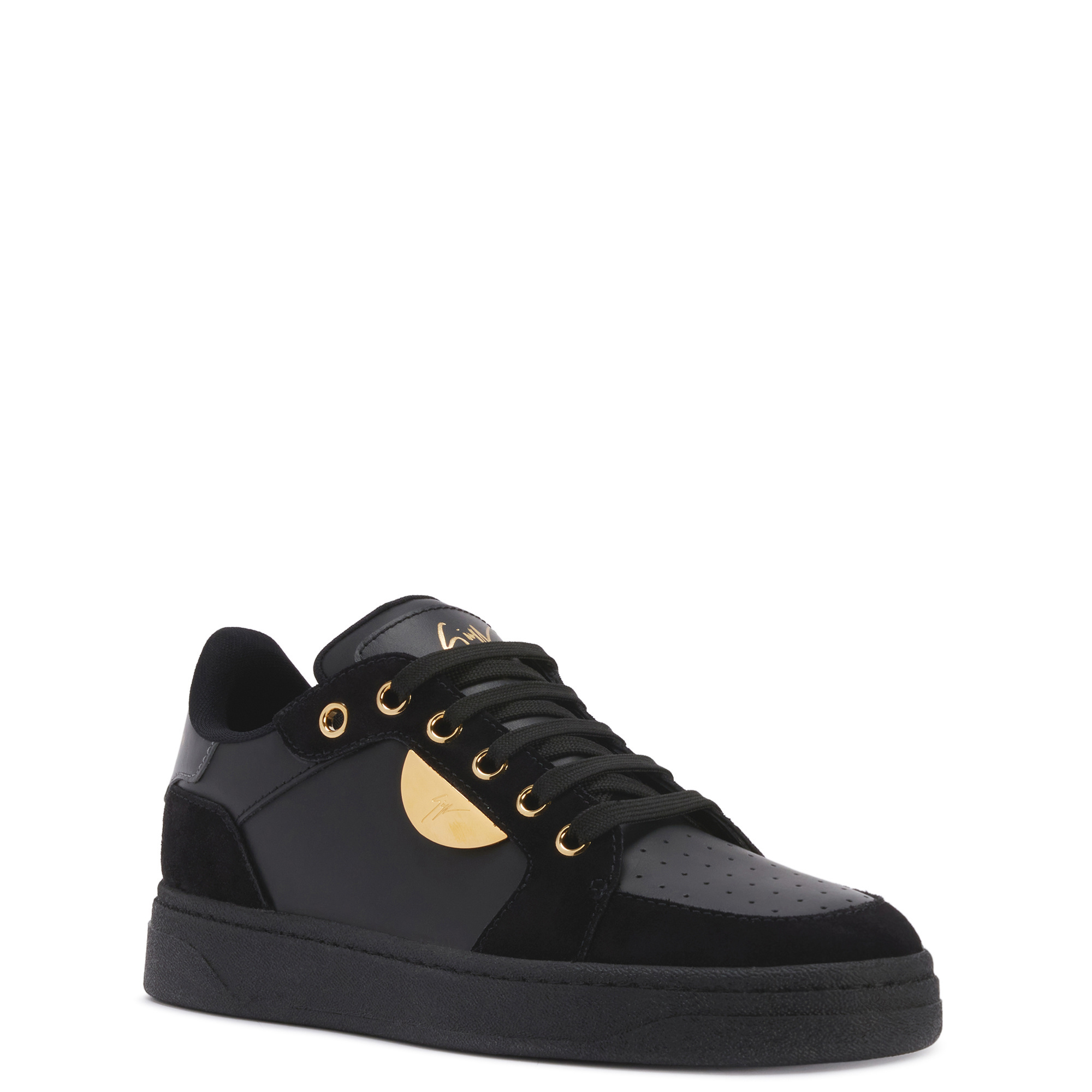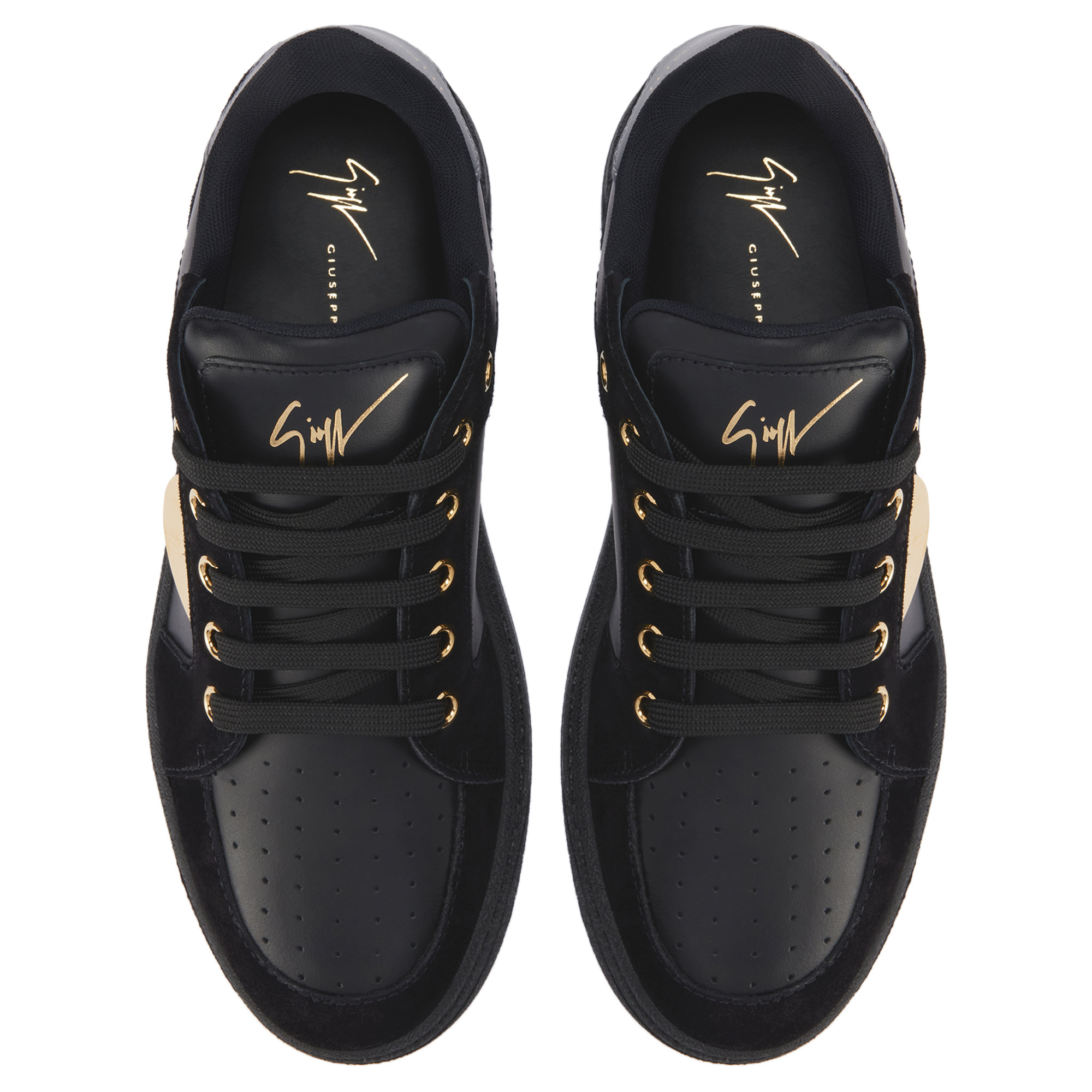 Low-top leather and suede sneakers with cotton laces, golden-finish metal eyelets, gold-colored hot-stamped Signature detail on the tongue, gold-colored logo lettering printed on the heel, and metal detail on the upper.