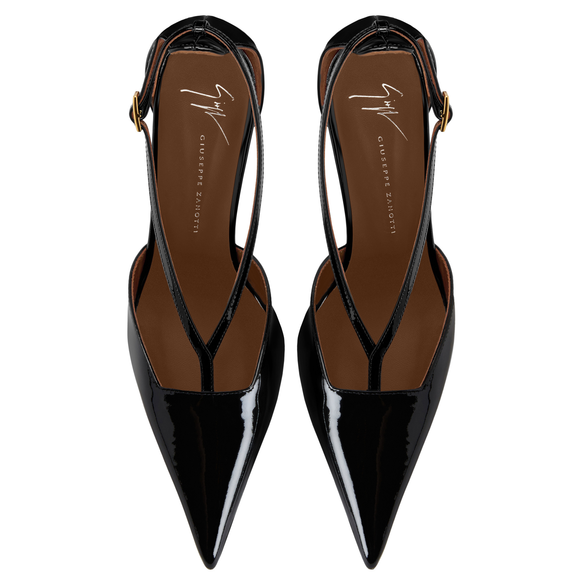 Closed-toe slingback pumps in patent leather with stiletto heel.