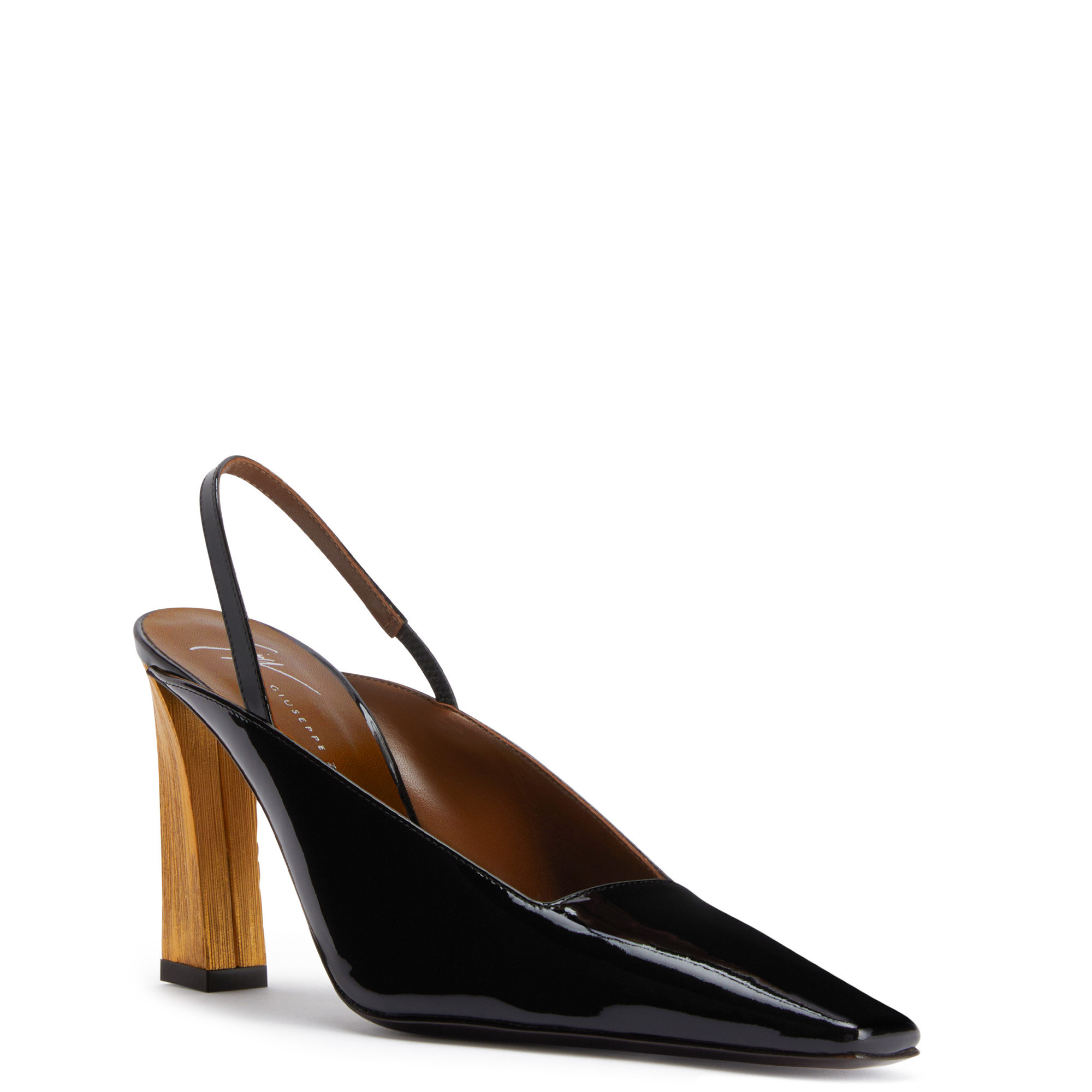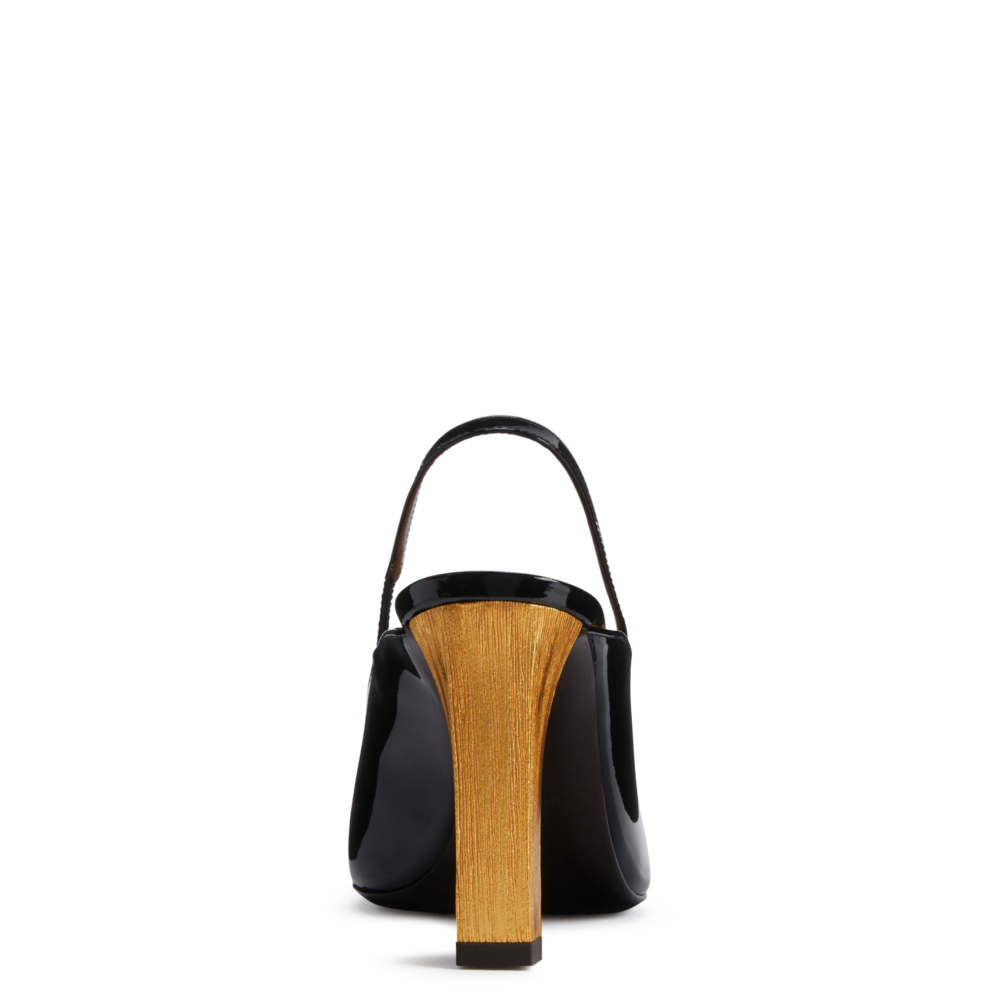 Slingback pumps in patent leather with square topline and toe, rear strap with elastic insert and knurled metal-effect block heel.