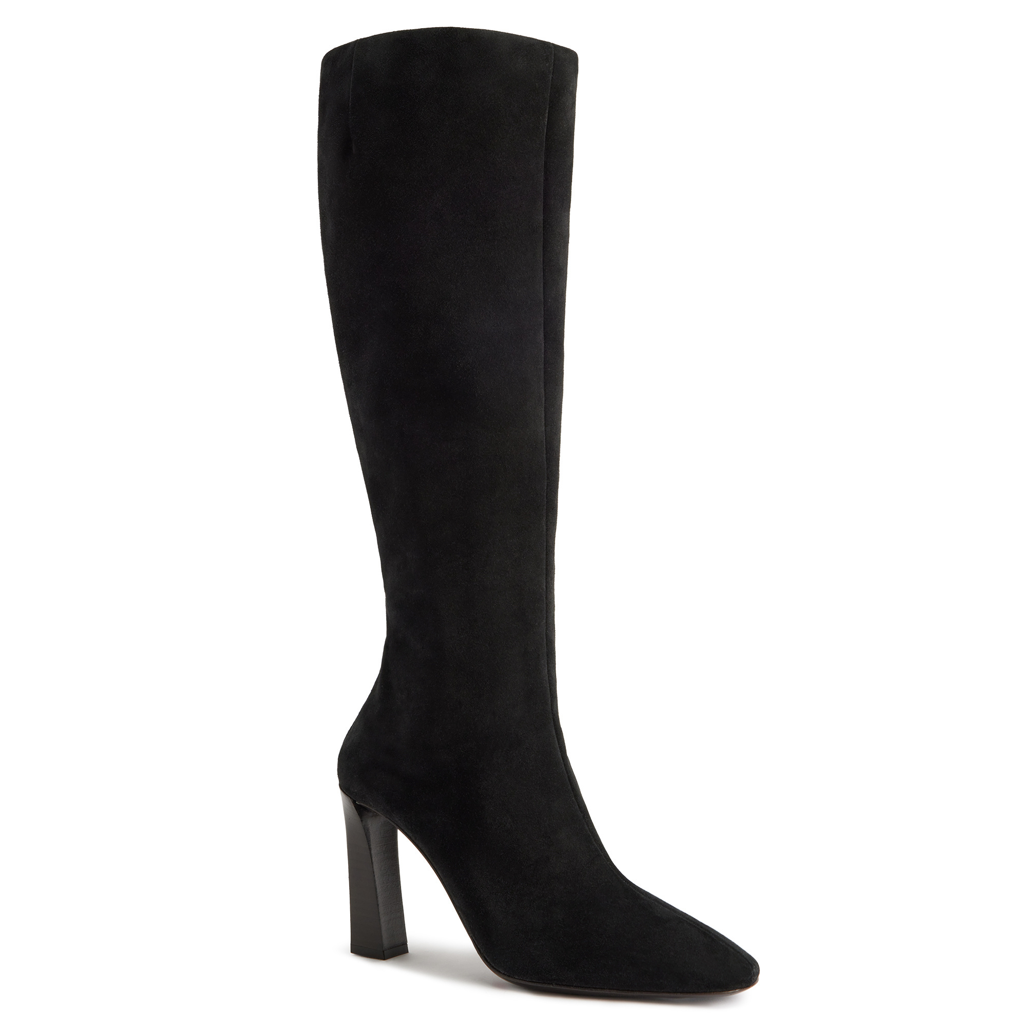 Knee-high boots in suede leather with rounded toe, rear zipper and leather-covered block heel.