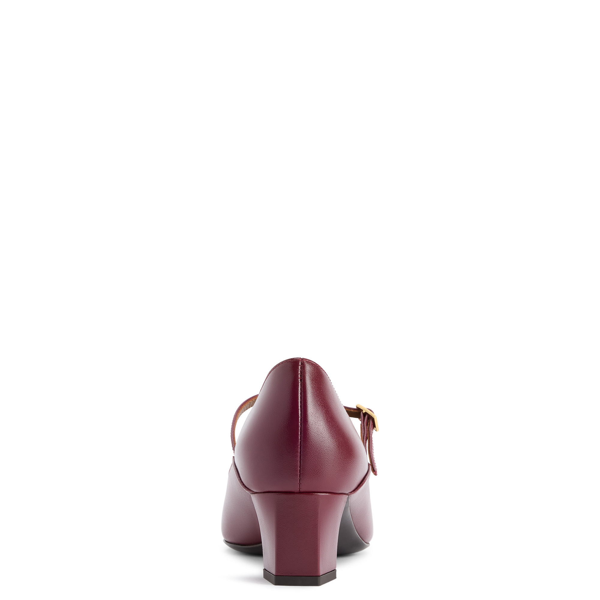 Mary Jane pumps in leather with square topline and toe, hammered metal toe detail and block heel.