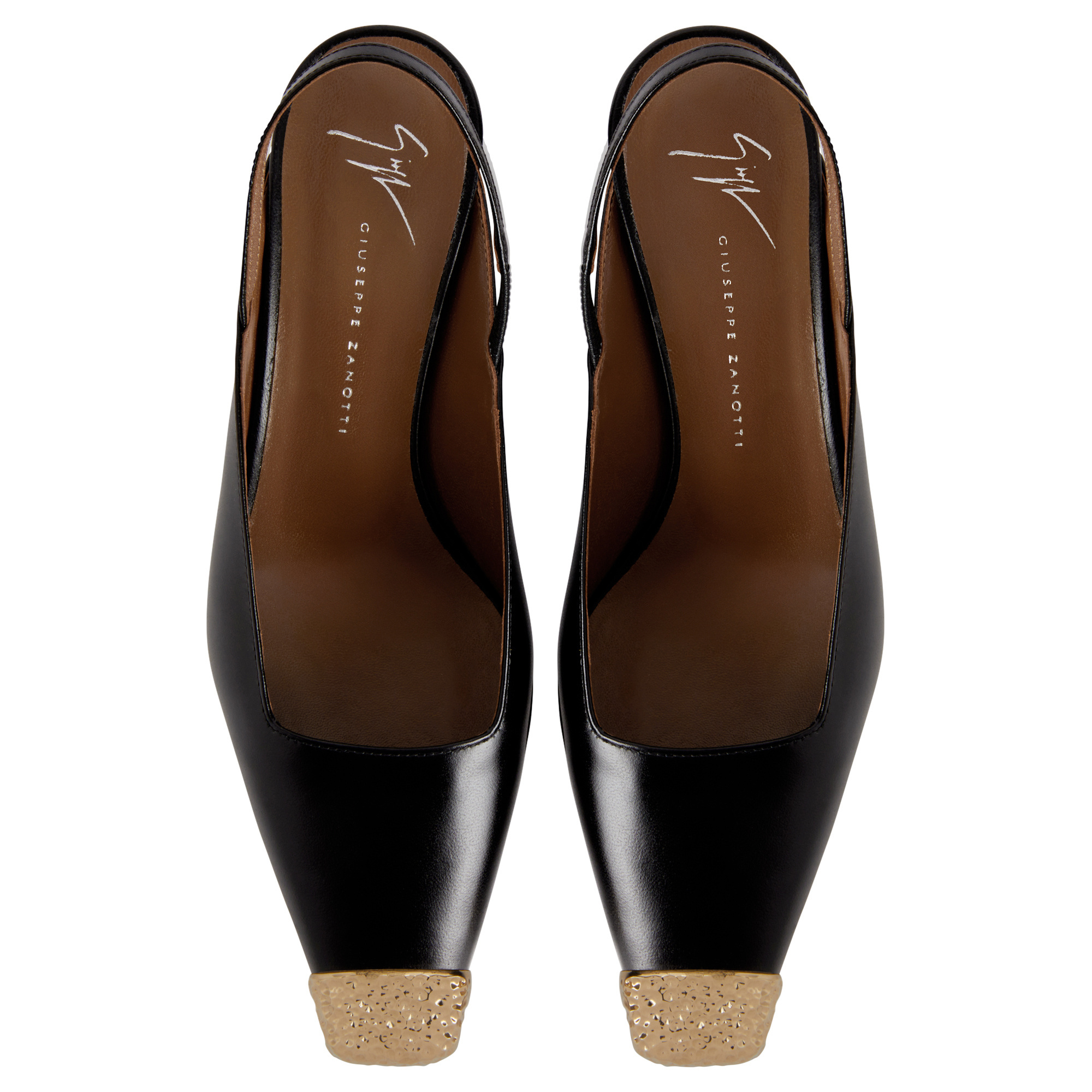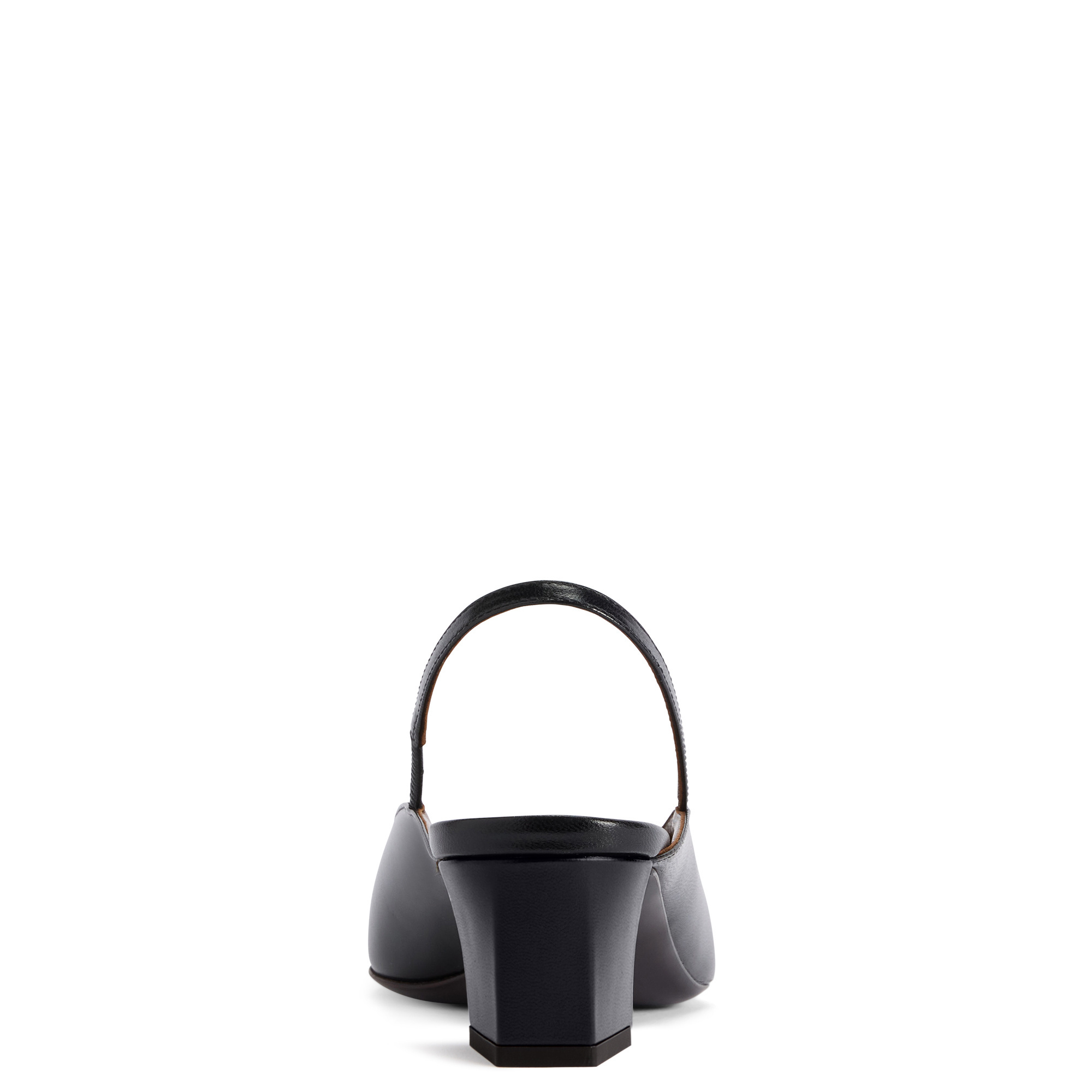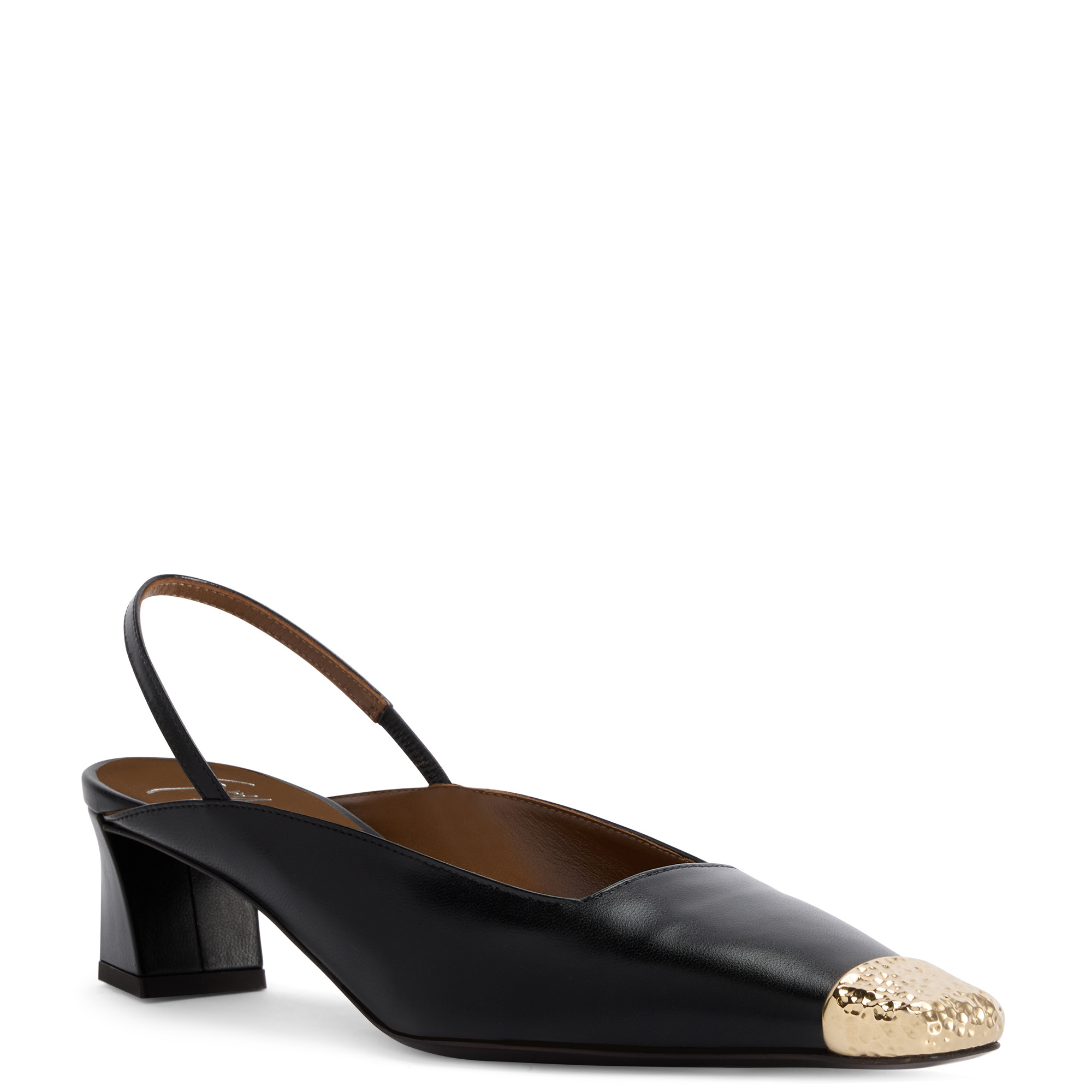 Leather slingback pumps with square topline and toe, hammered metal toe detail, rear strap with elastic insert and chunky heel.