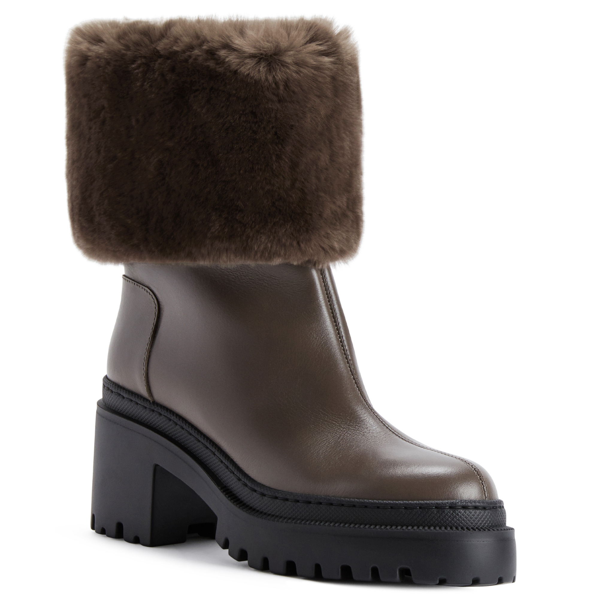 Leather ankle boots with fur cuff and rubber lug sole.