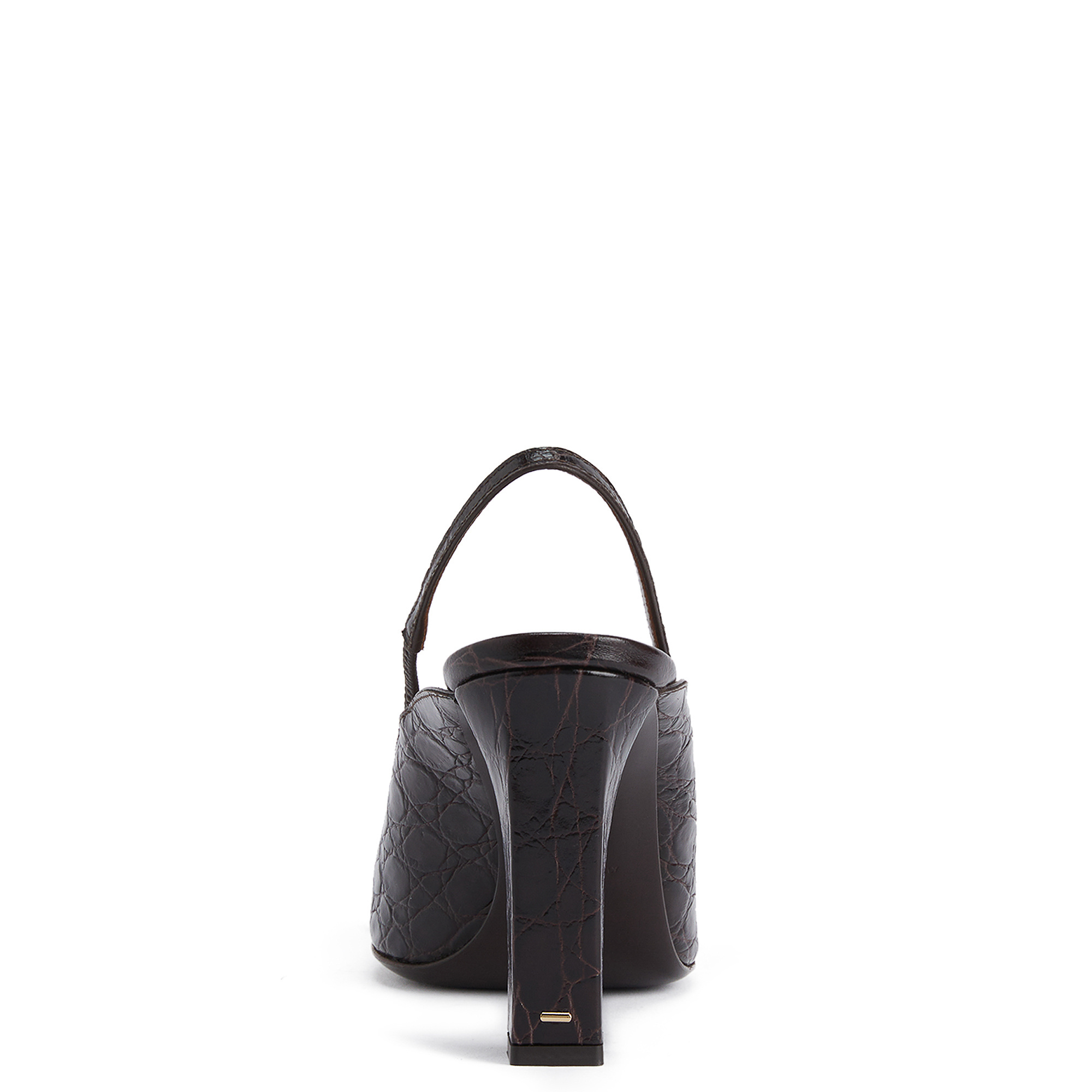 Slingback pumps in crocodile-print leather with square topline and toe, rear strap with elastic insert and block heel with metal stitch detail.