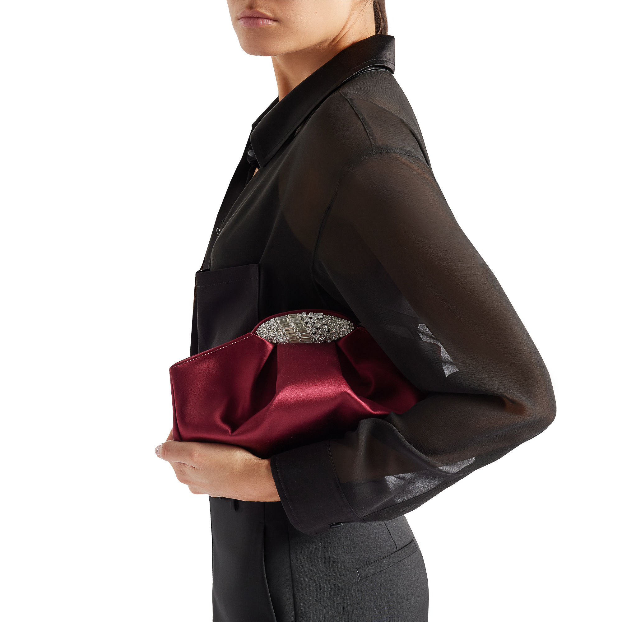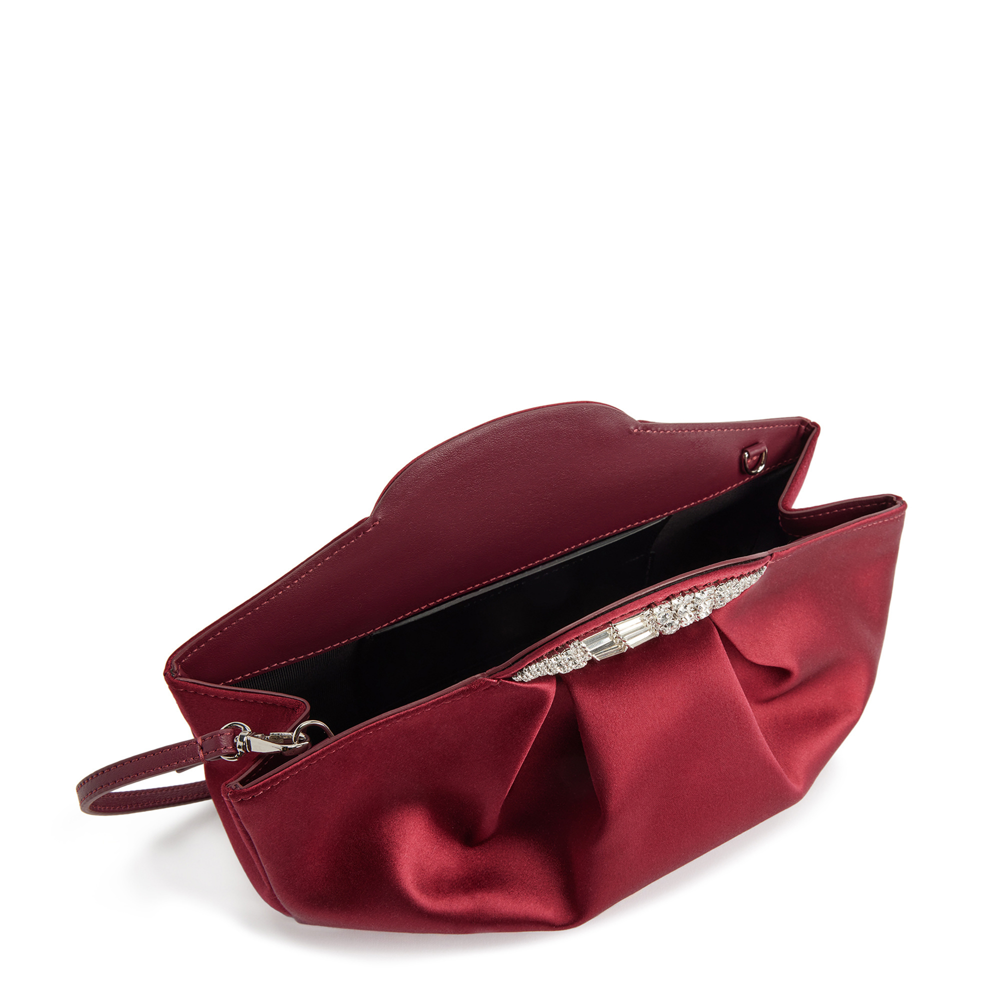 Silk clutch bag with snap fastening, jewel accessory with pavé-set crystals and inner leather strap.