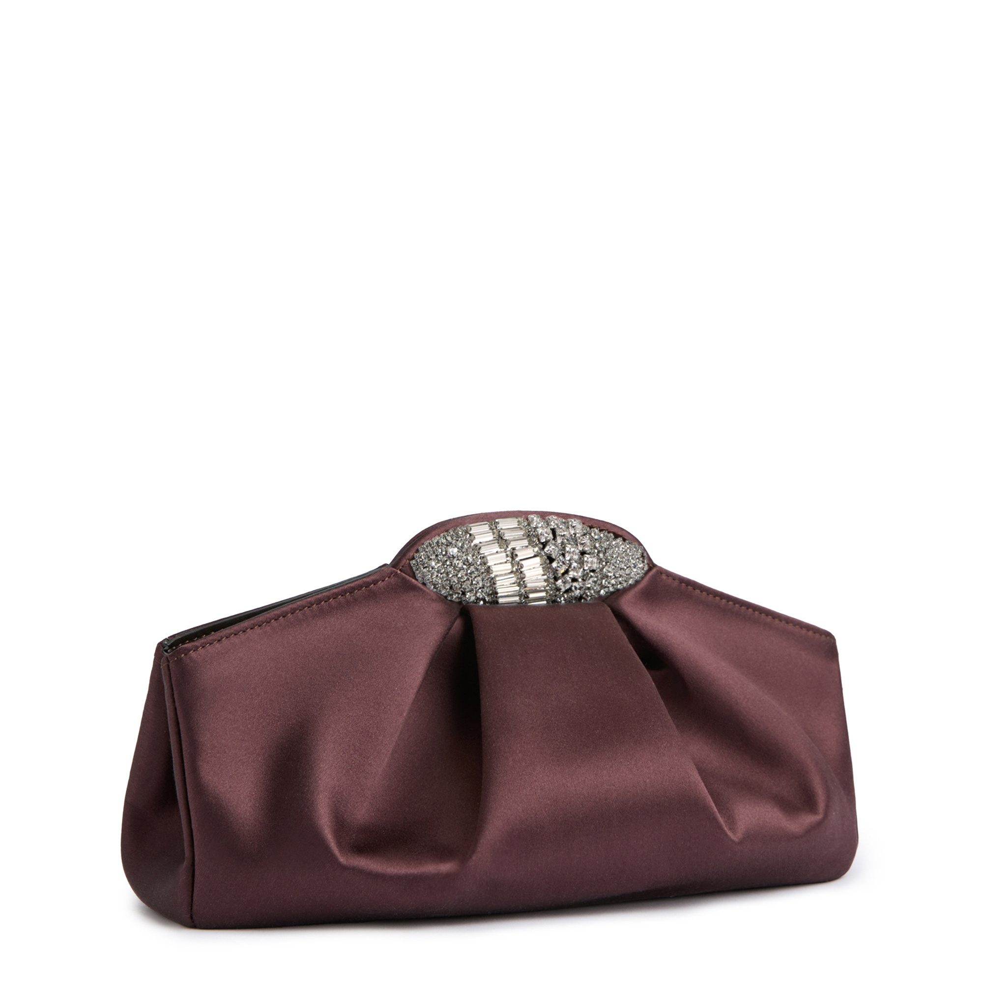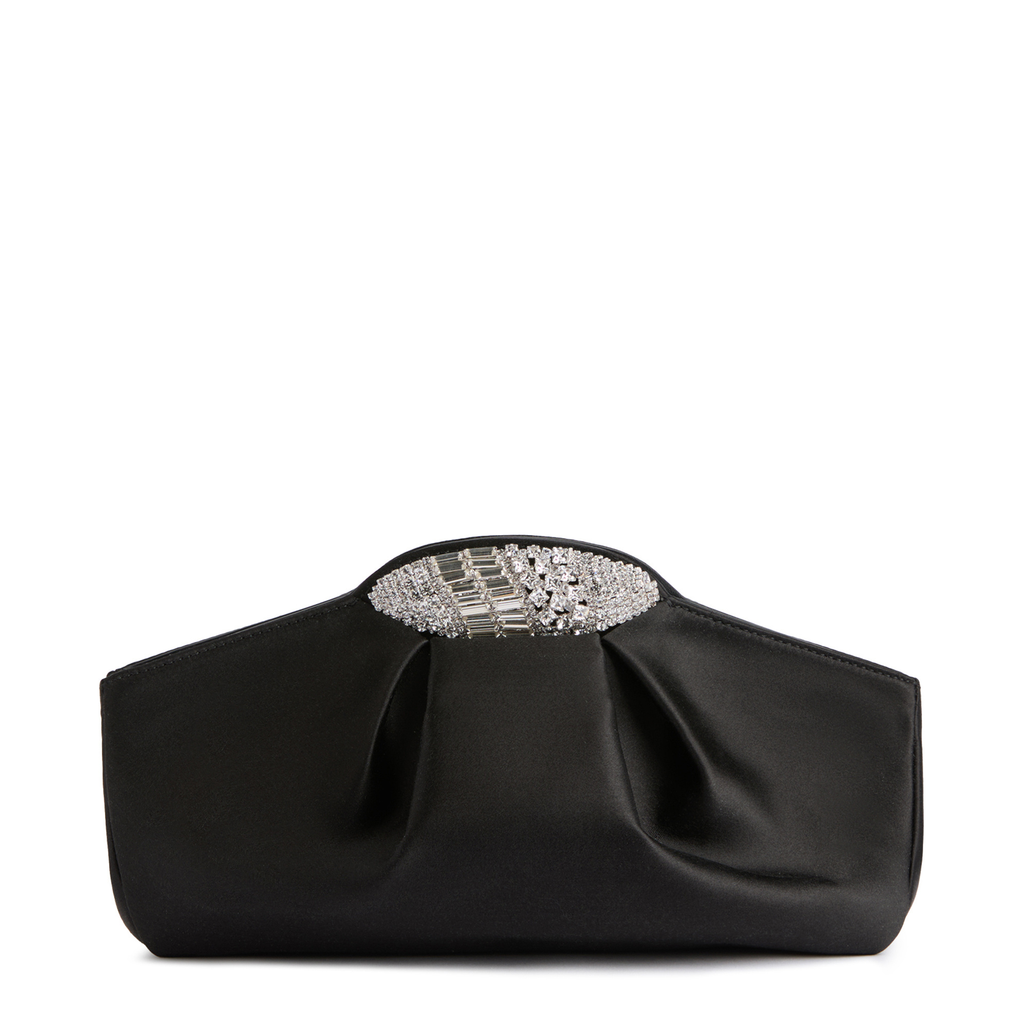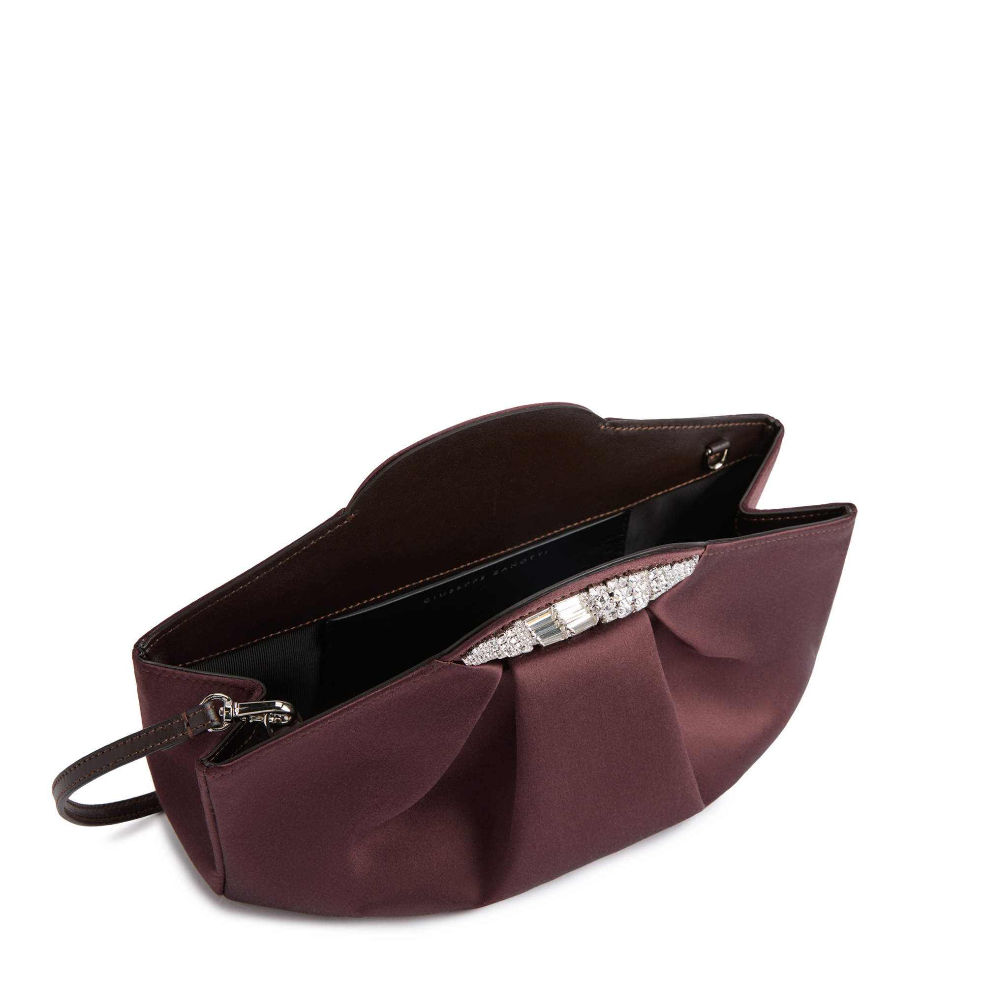 Silk clutch bag with snap fastening, jewel accessory with pavé-set crystals and inner leather strap.