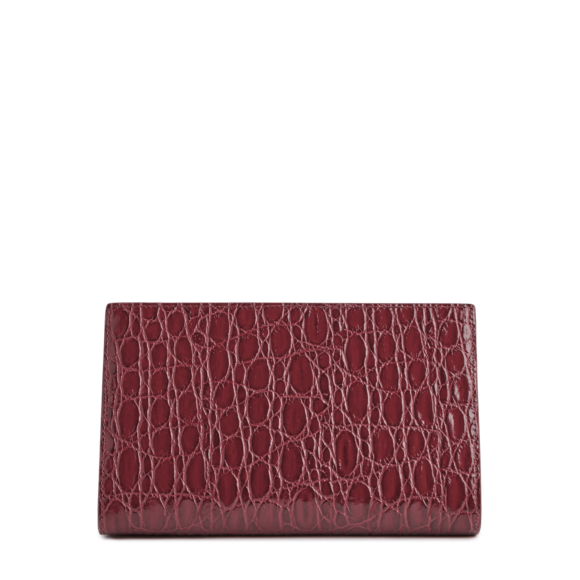 Clutch bag in crocodile-print leather with central fastening, chain shoulder strap and inner pocket.