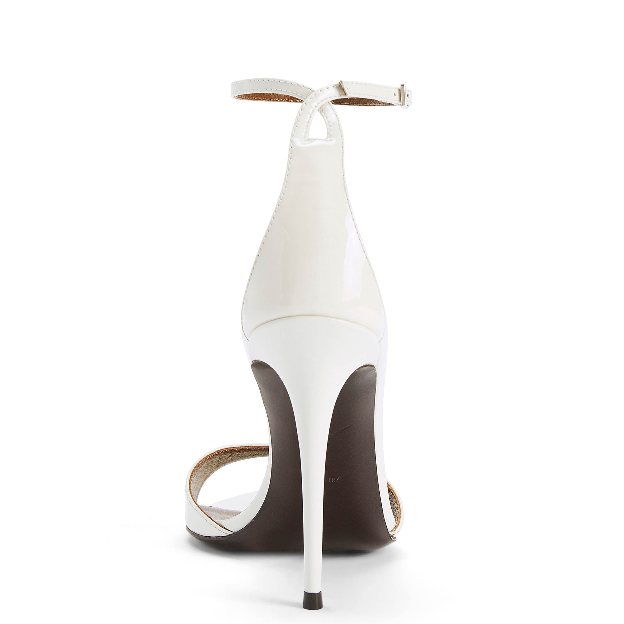 Pointed open-toe sandals in patent leather with strap and stiletto heel.