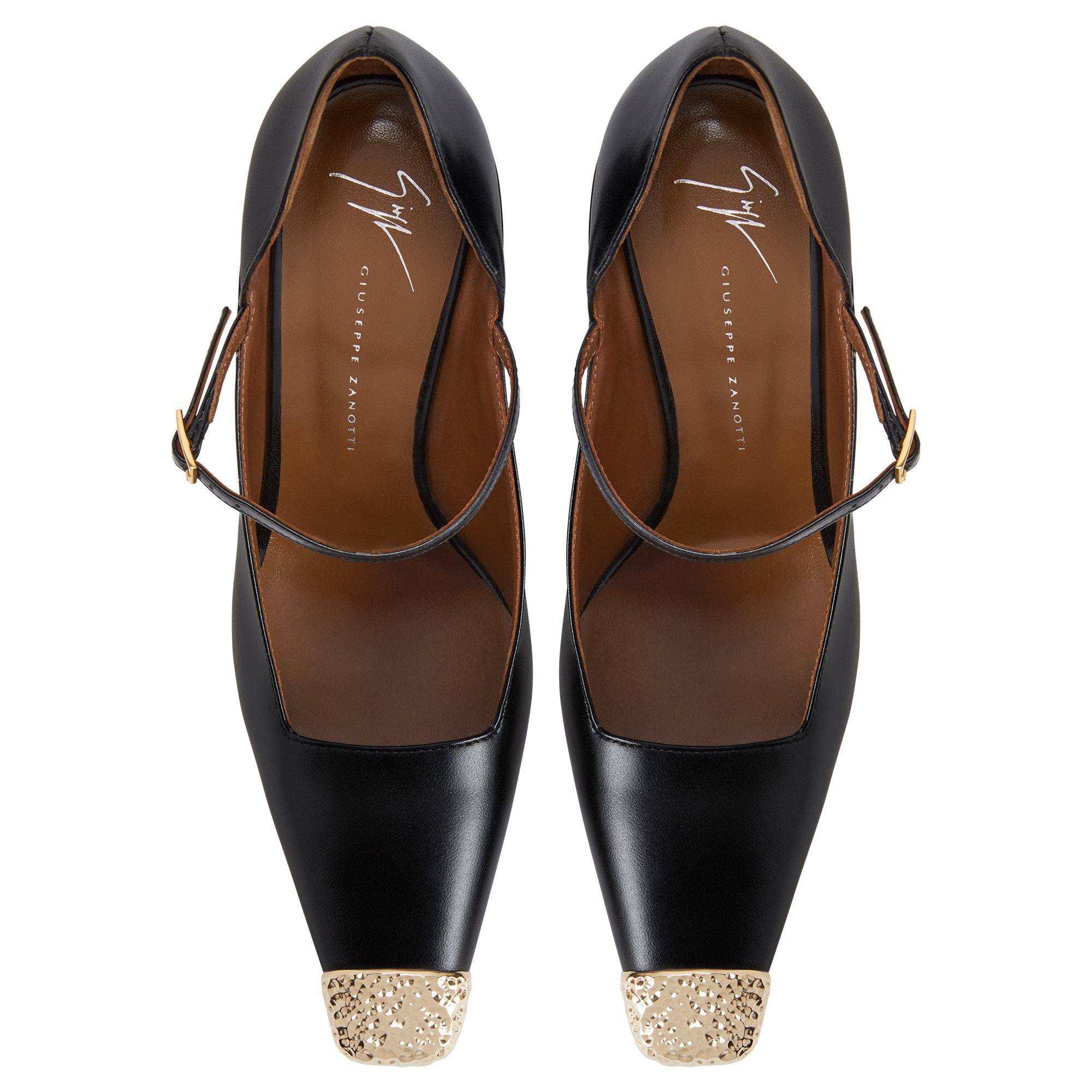Mary Jane pumps in leather with square topline and toe, hammered metal toe detail and block heel.