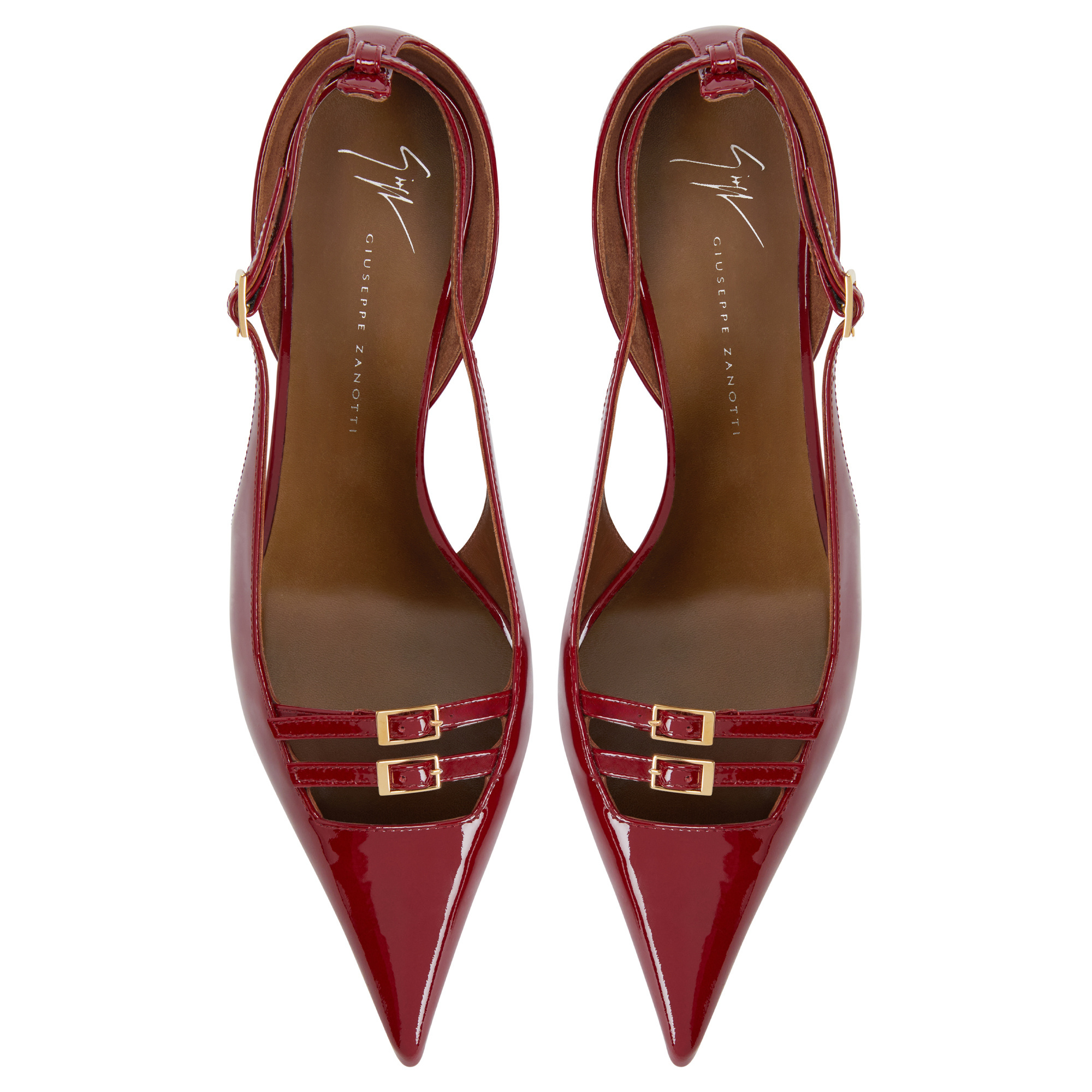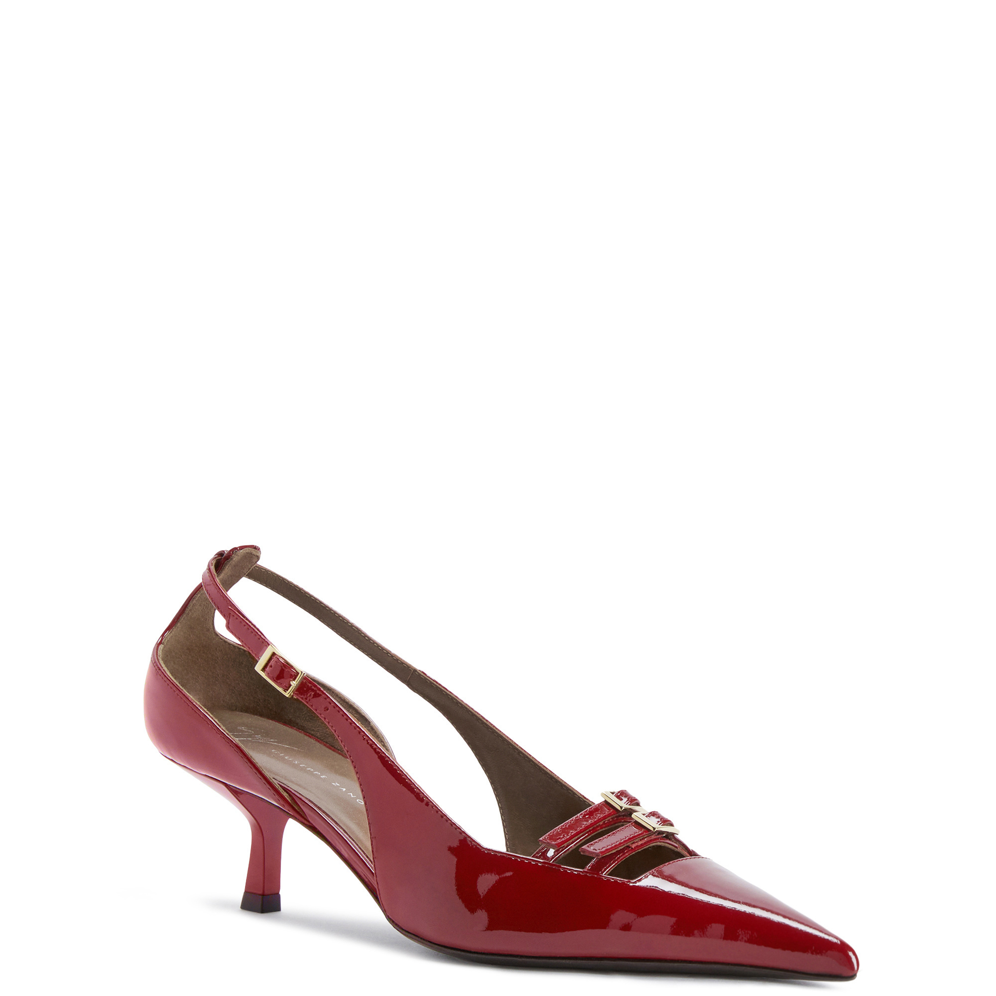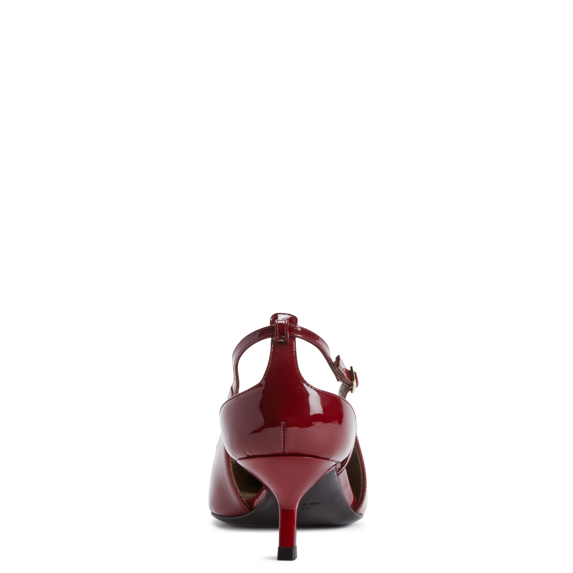 Pointed-toe slingback patent pumps with square topline, buckled strips, adjustable rear strap with metal buckle and kitten heel.