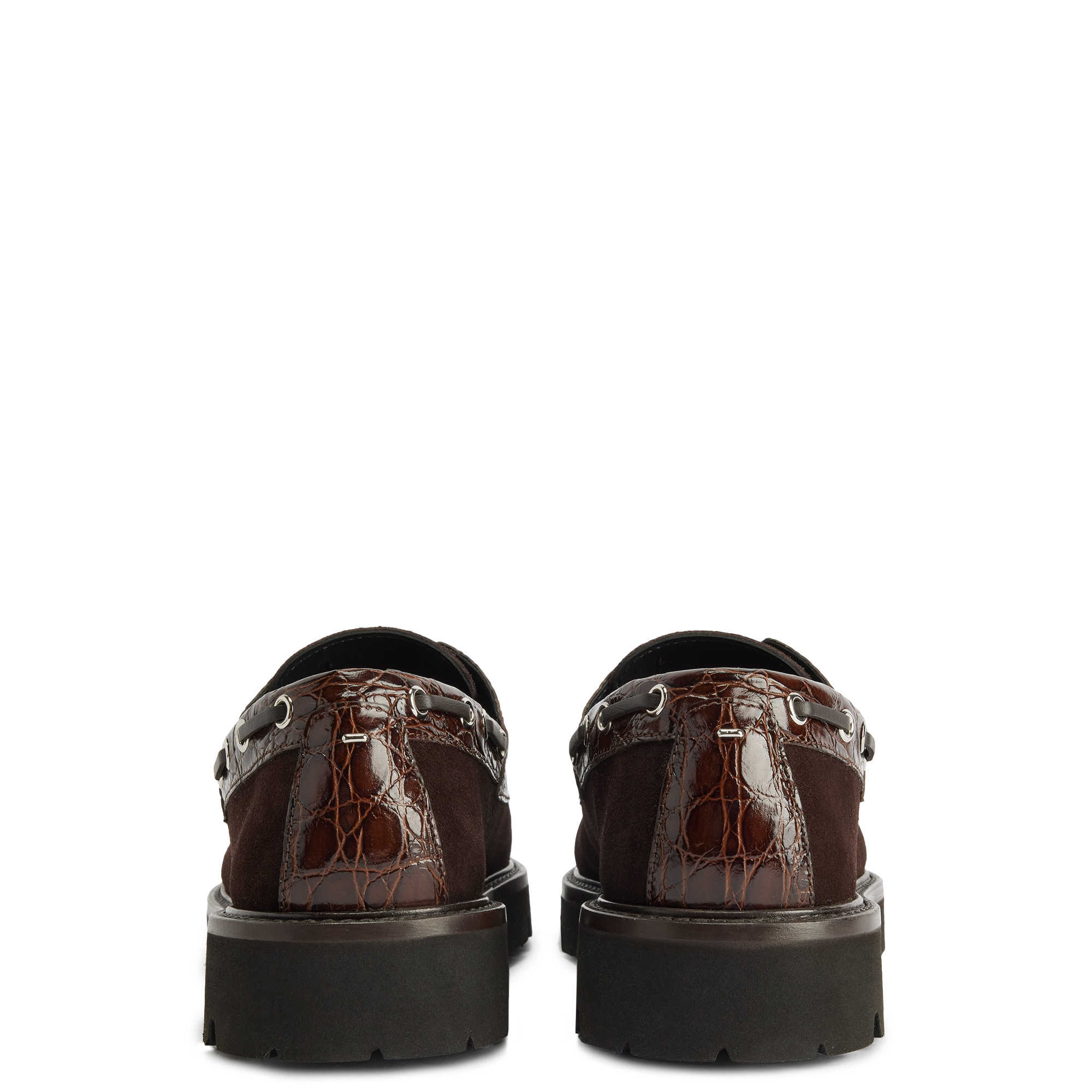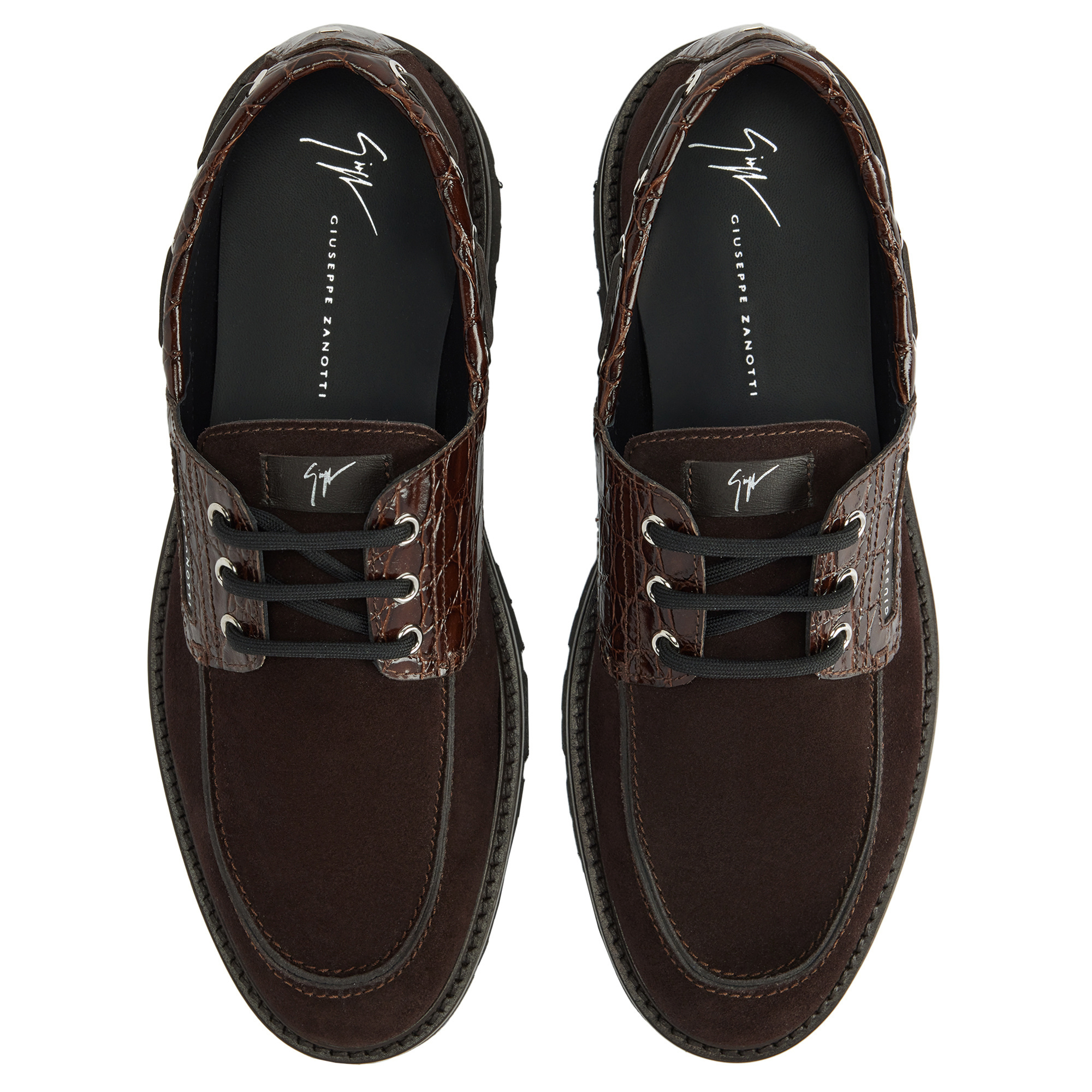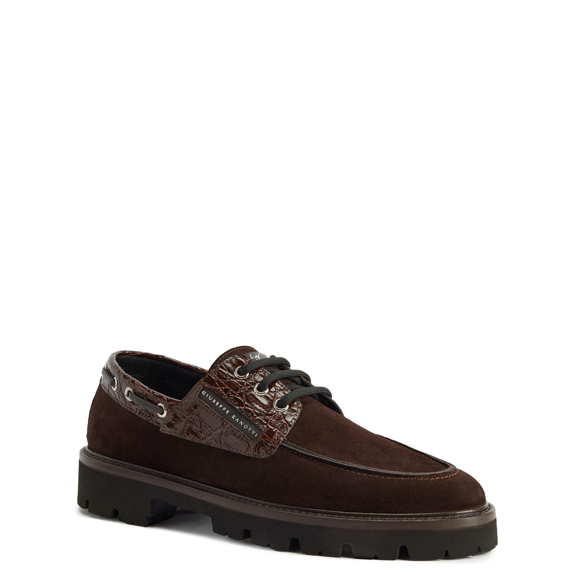 Lace-up shoes in suede leather with crocodile-print leather details and rubber one-piece sole.