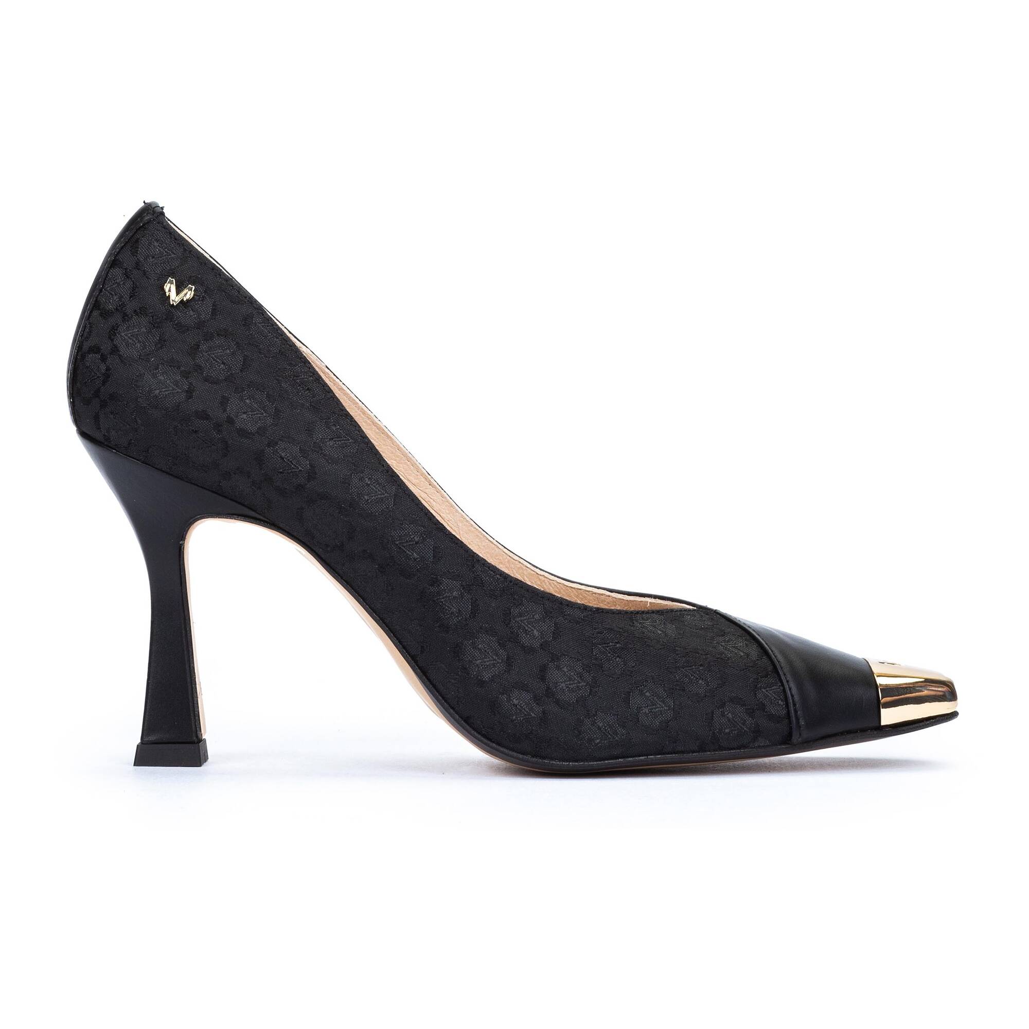 Zapato de tacón con punta cuadrada bicolor y detalle metálico en la punta.