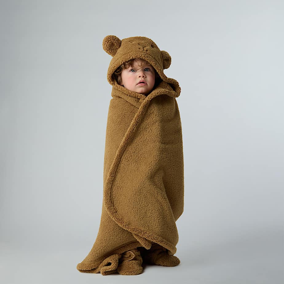 Es besteht aus einer quadratischen Decke mit Kapuze, Bärengesicht und angenähten Ohren.